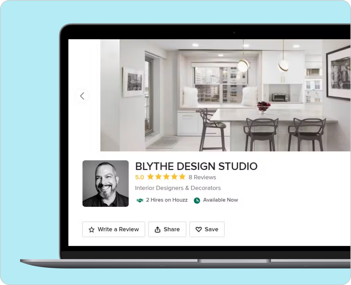 ...Most renovation projects are local, so having enhanced exposure through the Houzz program in our area ensures we are being seen by consumers who are actively looking to hire a designer for an upcoming project. Through Houzz, we have a combination of large and small projects, which we consider a good mix."