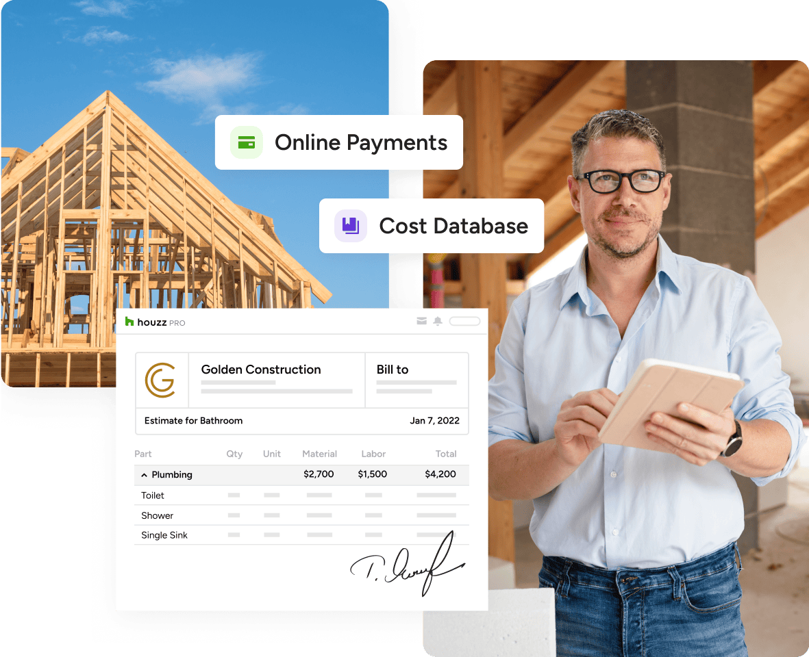 Why not speed up your workflow? Clients on Houzz Pro approve their estimates within 25 hours and pay online within 23 hours, on average.*