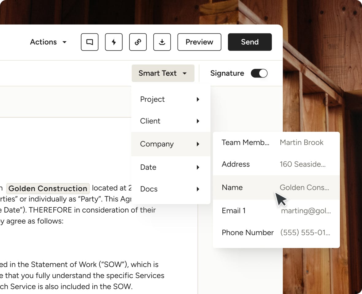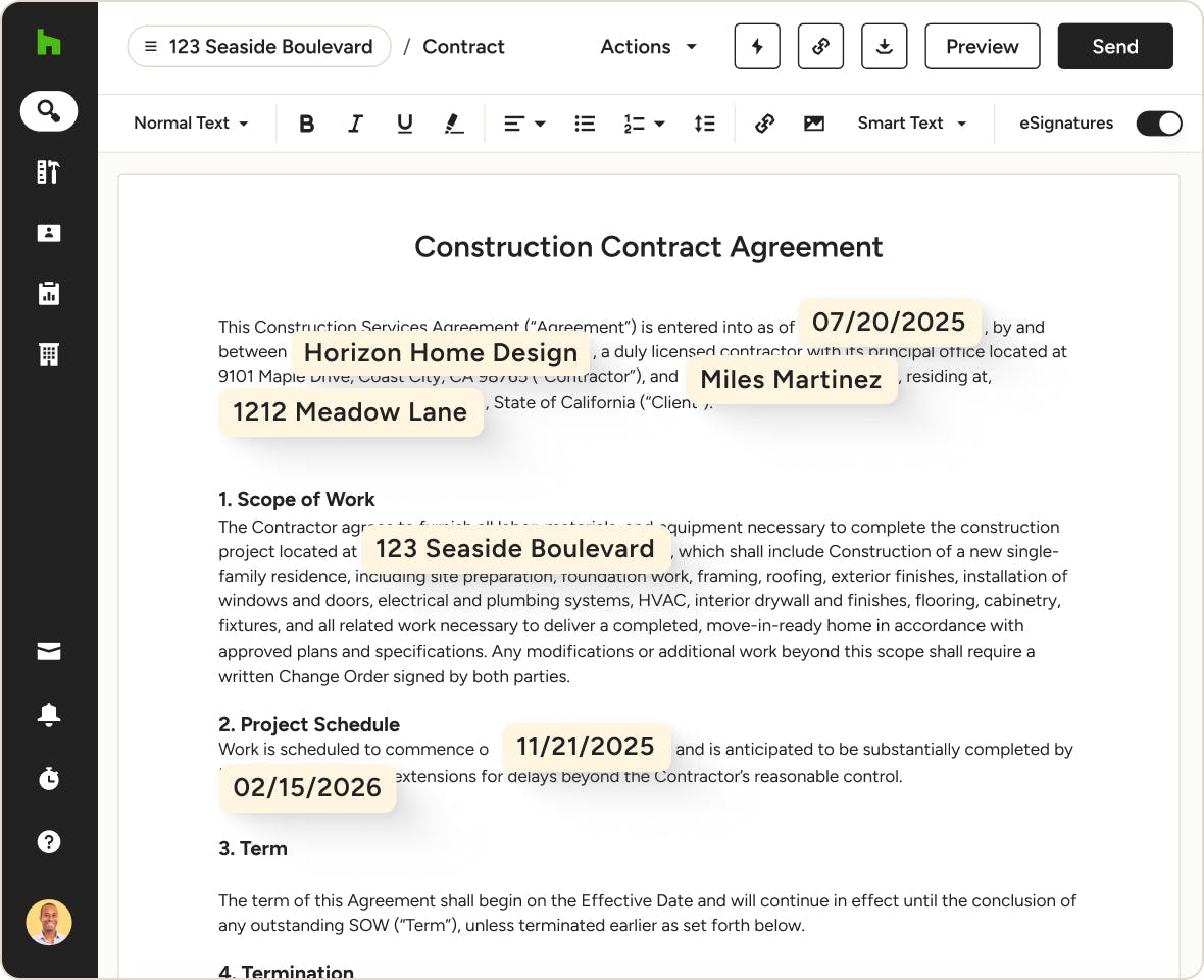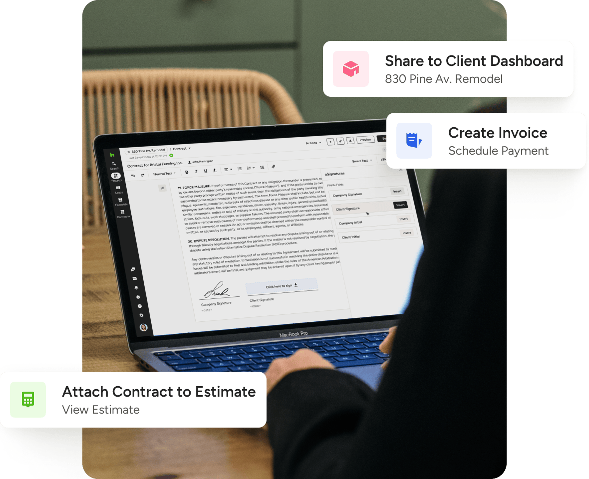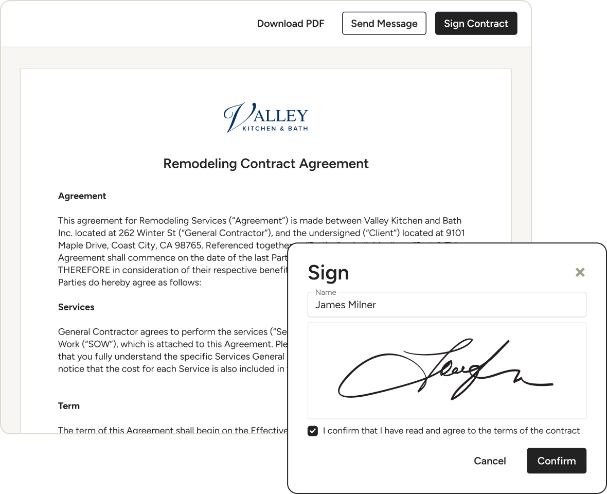 Start your projects on the right foot, every time. With Houzz Pro’s Contract management software, you can easily draft and finalize legal agreements in the same place you’re already working—eSignatures included.