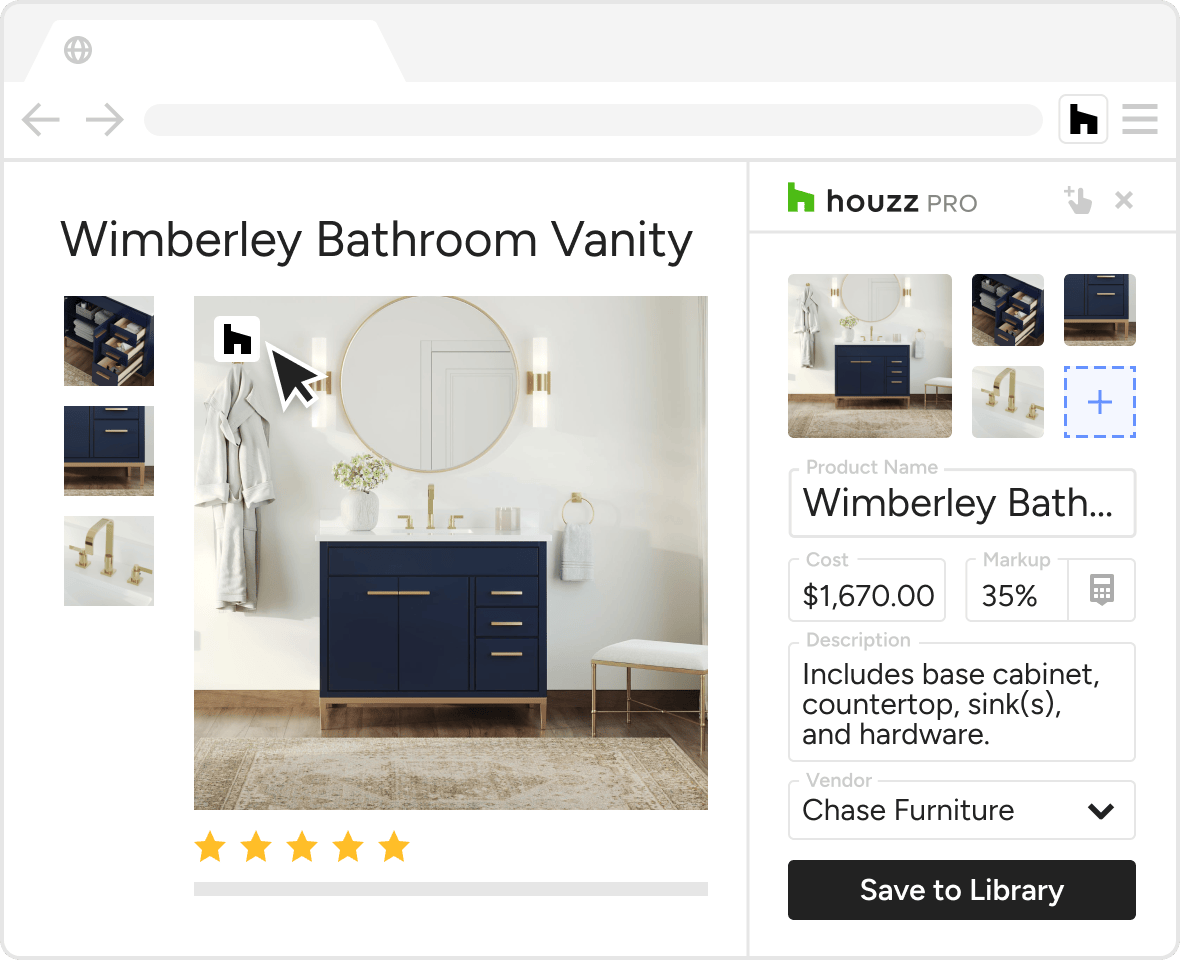 Don't let sourcing slow your workflow. Our Mood Board maker online tool is designed to streamline image-adding from Houzz or anywhere else on the web.