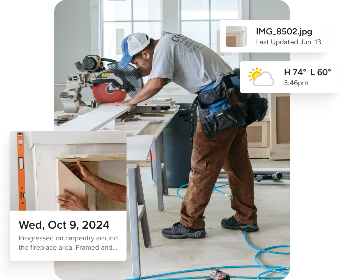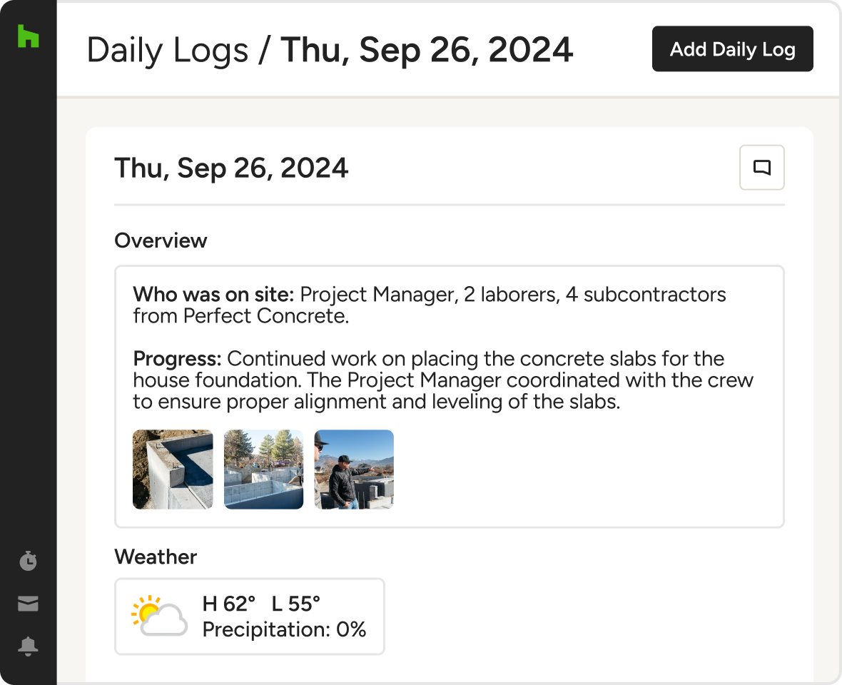 Whether you get updates from subs or create updates for clients, our construction Daily Log tool makes it easy for anyone on your team to document and share progress.