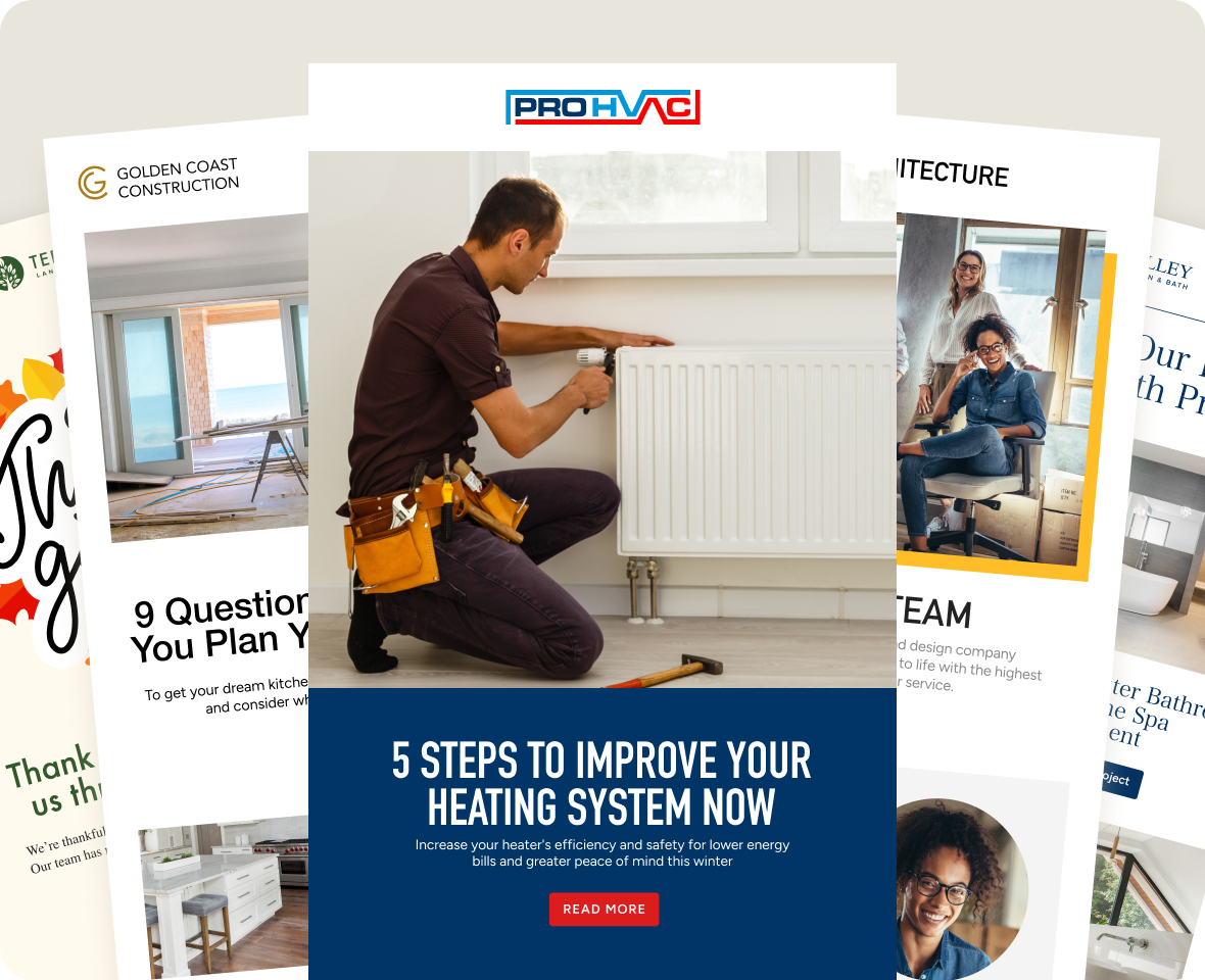 You’ve earned stellar client reviews, but how can you increase your chances of earning repeat business? The answer: email marketing. Upholding your reputation as the best HVAC contractor in town is easy when you can send curated newsletters, project photos, testimonials and more directly to your clients’ inboxes. With Houzz Pro’s HVAC business software, you’re not expected to be a developer or email marketing expert. Drag and drop tools and email templates make sending email newsletters more fun than you could ever imagine.