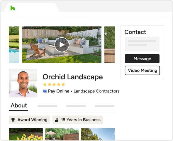 Discuss projects from the convenience of your home while building relationships face-to-face virtually. Let landscape contractor leads book a video meeting with you directly from your profile or your directory listing. Or, share your personal meeting link in email or social media.