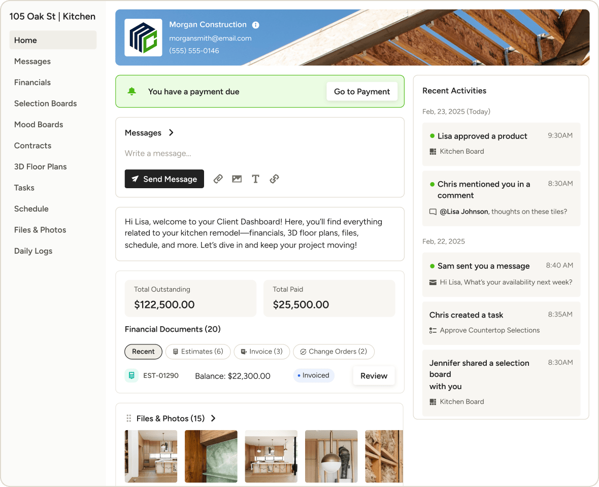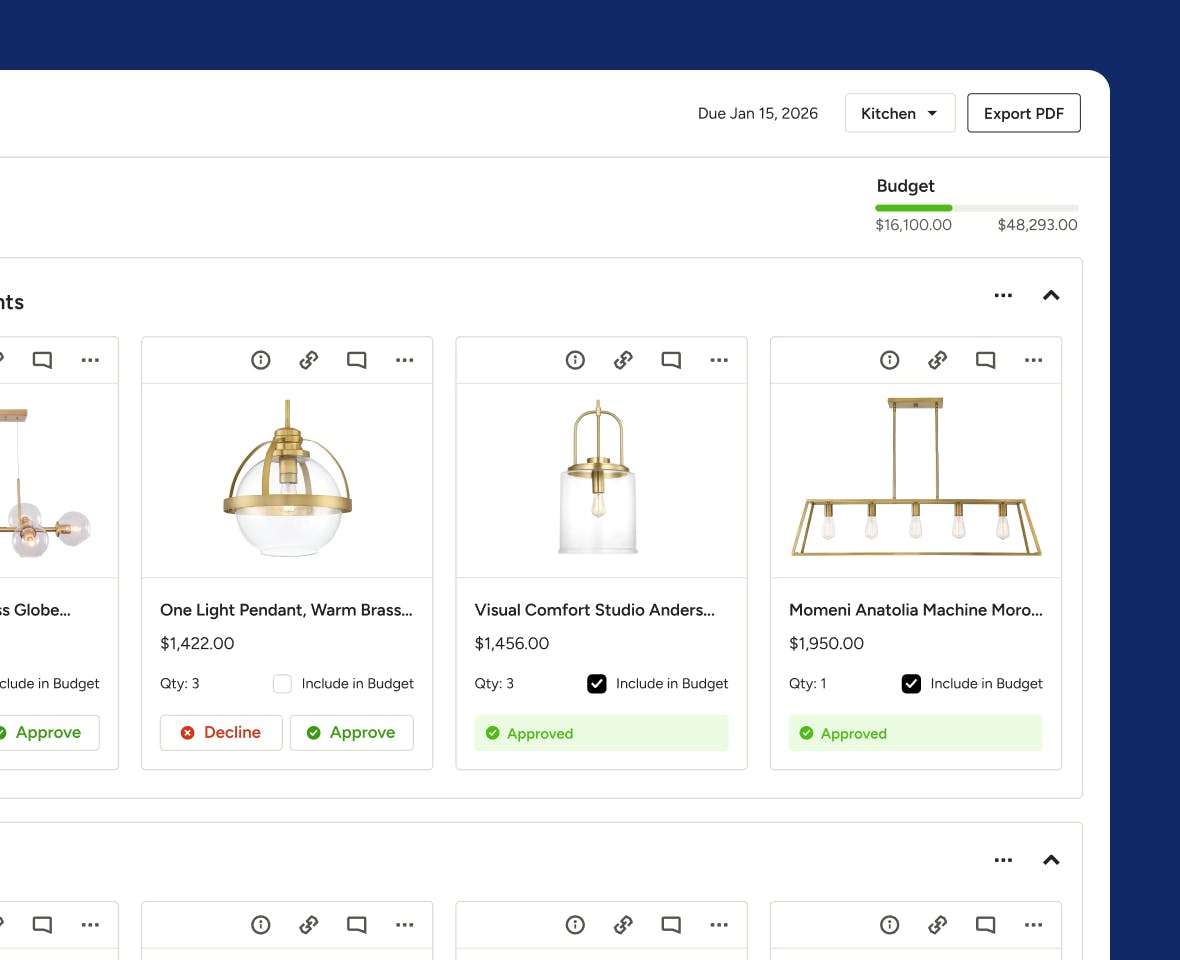From tile to countertops and beyond, showcase it all in clear, visual boards that help clients decide on selections sooner—and let team members track approvals in one place.