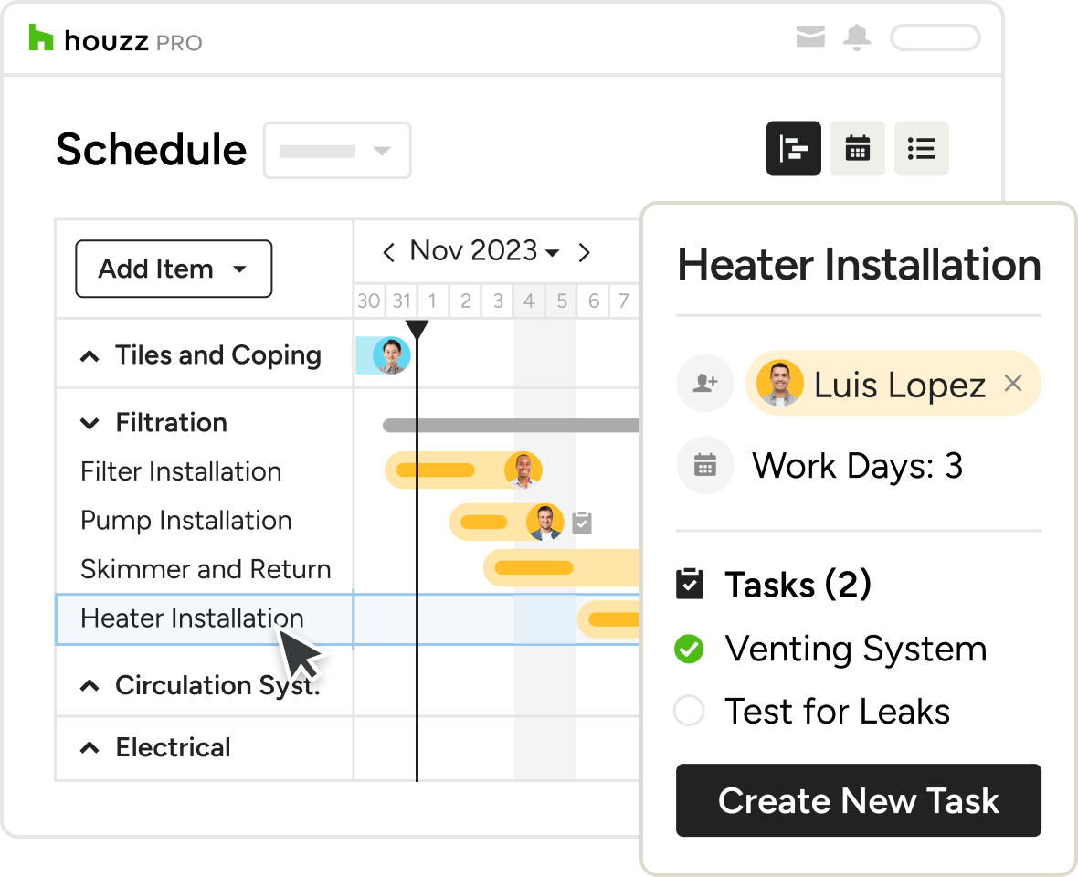 Gone are the days of spreadsheets and papers strewn across your desk. Work smarter, not harder with the Houzz Pro Project Dashboard.