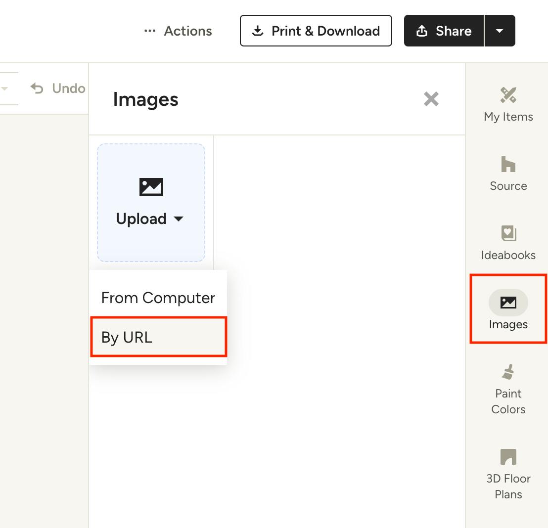 Next, click Images from the mood board's right panel, click the Upload option and select By URL from the menu.