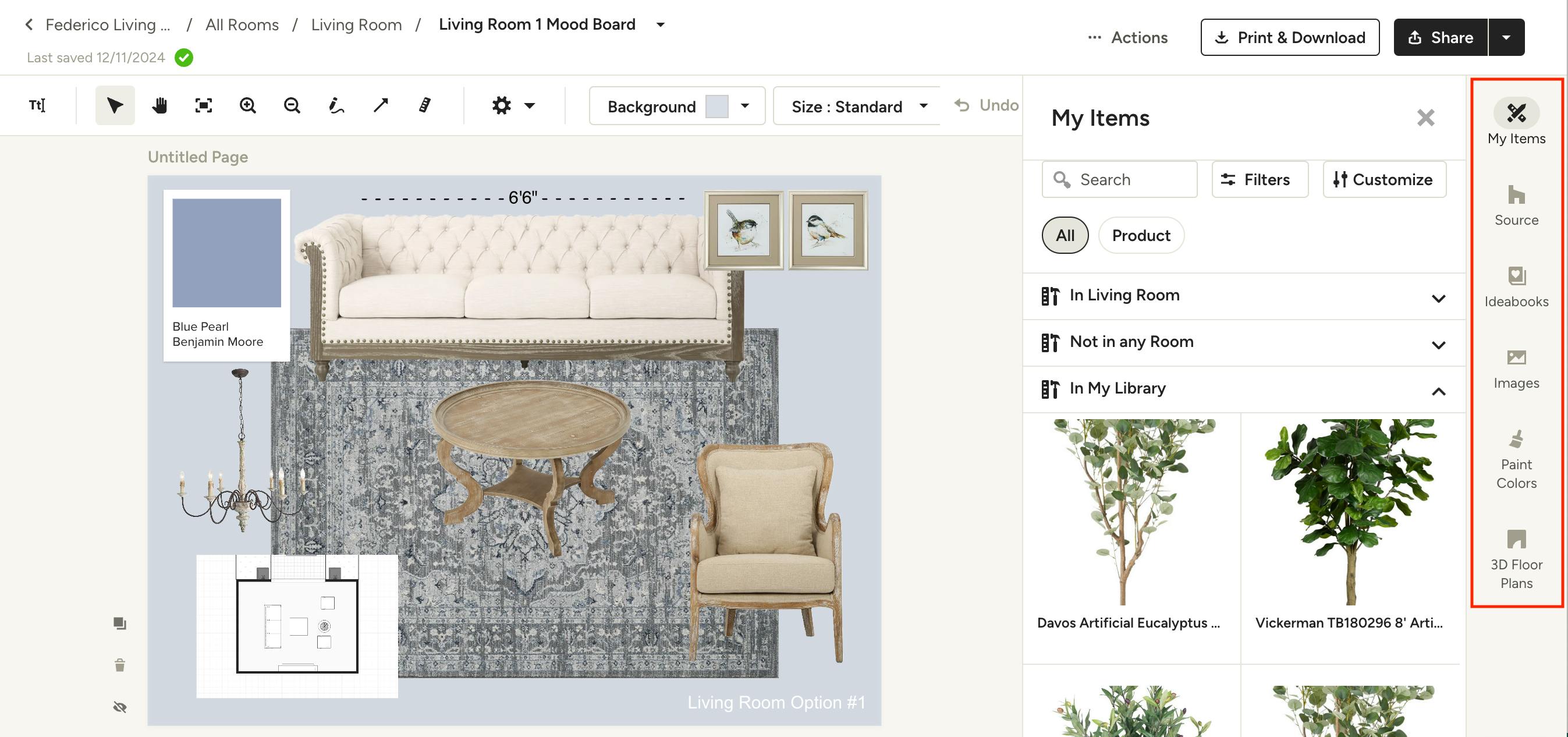 You can add items from your My Items library, source them from Houzz Marketplace, use ideas saved to your Ideabooks, add images, insert 3D Floor Plans, or find paint swatches from our partnerships with Benjamin Moore or Sherwin-Williams. Here's a breakdown of all the possibilities you'll find in right side panel: