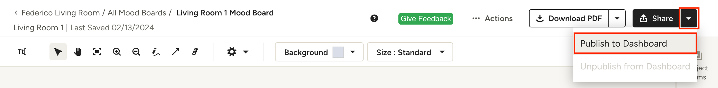 To make your mood boards visible on the client's dashboard, click the arrow next to the Share button in the top right and select Publish to Dashboard. You can also unpublish mood boards from the client dashboard here too.