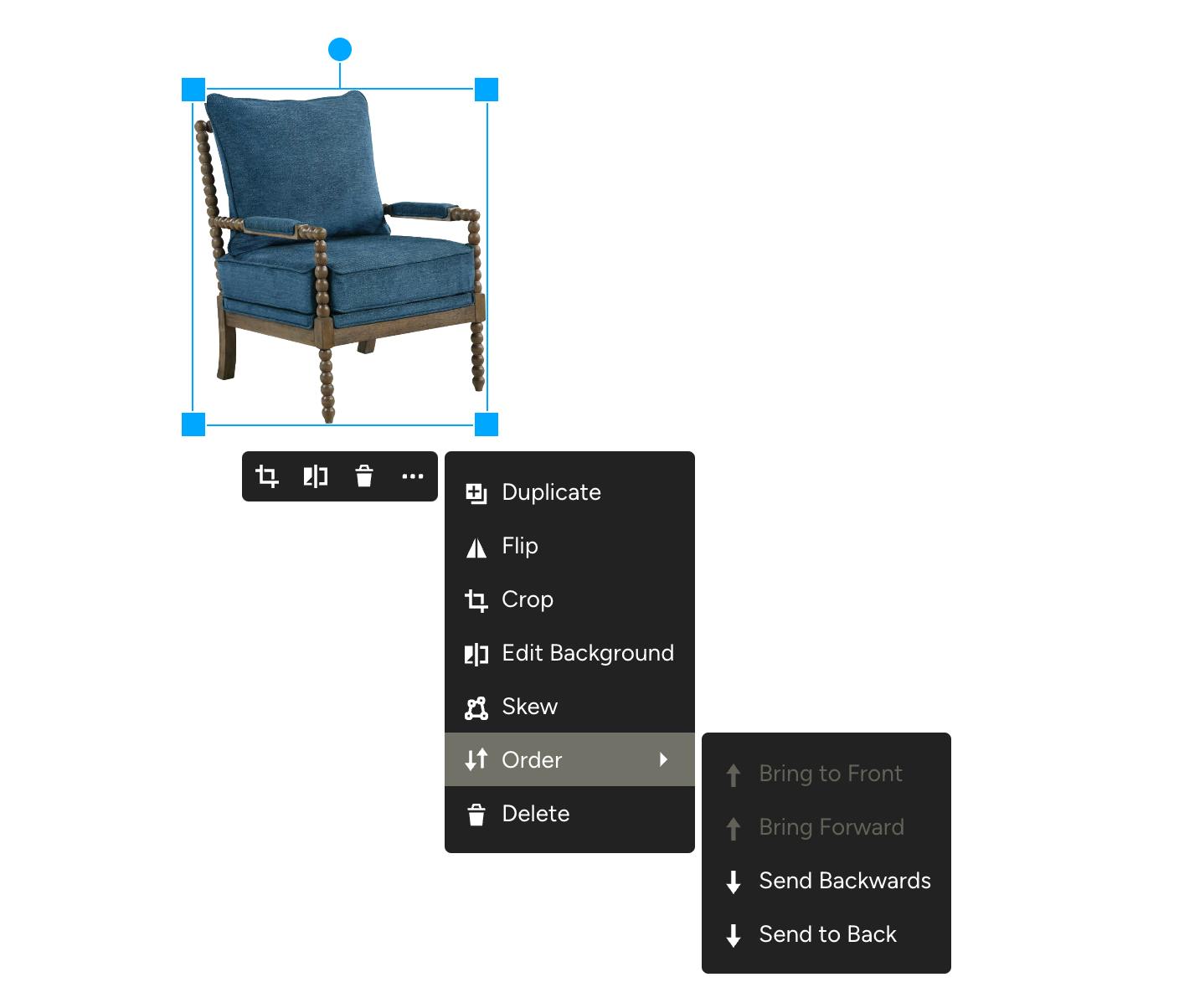 You can order/layer your product images in front of or behind one another by using the Order option. If you want your product to be brought to the front of all other images, click “Bring to Front”; if you want it to be moved behind all other items, press “Send to Back”. You can use "Bring Forward" or "Send Backwards" to move an item forward or backwards one layer at a time to precisely position things for an accurate representation of the space.