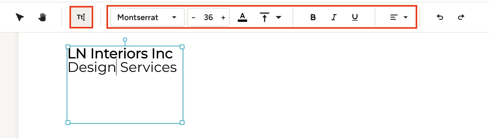 To add text to your mood board, click the text icon then click in your board. You can click and drag the corners of the text box to adjust to the size you'd like — the text will wrap accordingly. Format the text using the options in the toolbar, including font, color, alignment, size and more.