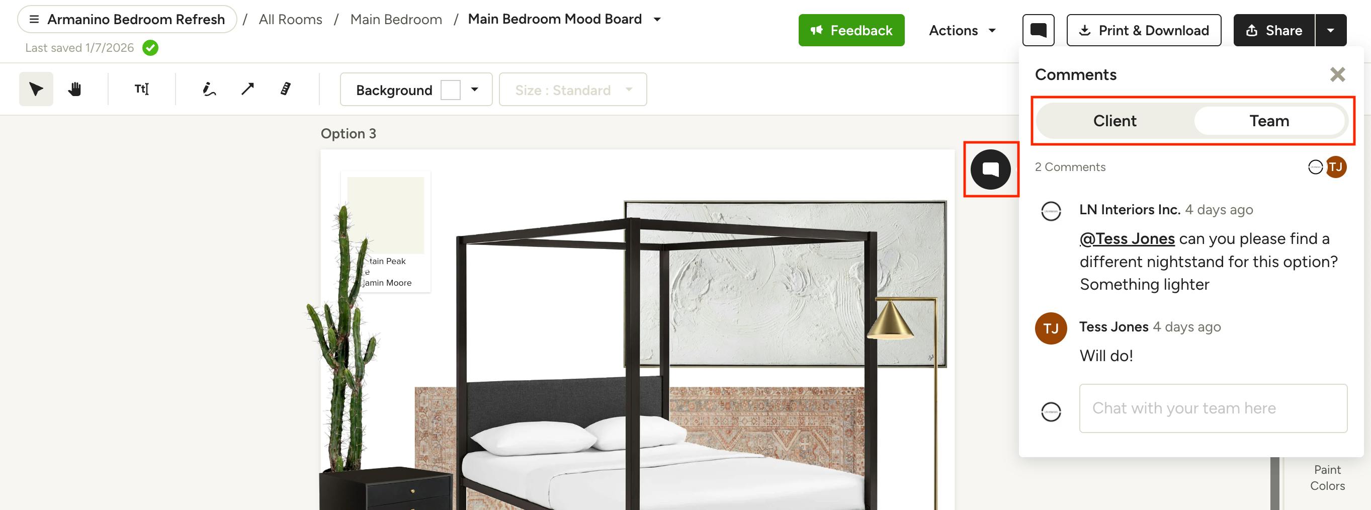 For quick collaboration between your team and/or your clients, you can use the comment feature on mood boards. This allows for in-context feedback that you can tie directly to individual items or an entire page, so you can spend less time going back and forth and more time perfecting the project. Learn more in How to Comment on Mood Boards.