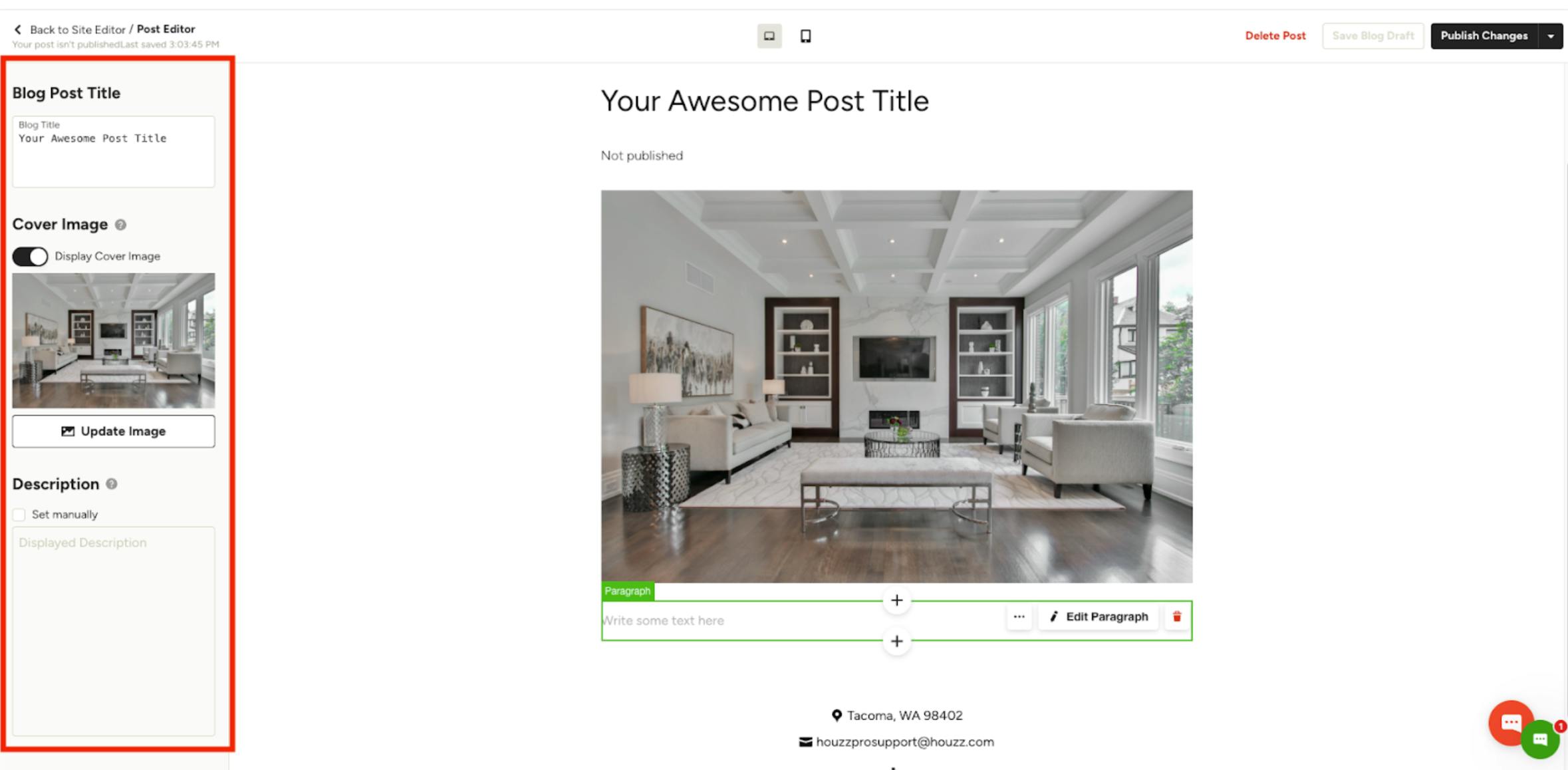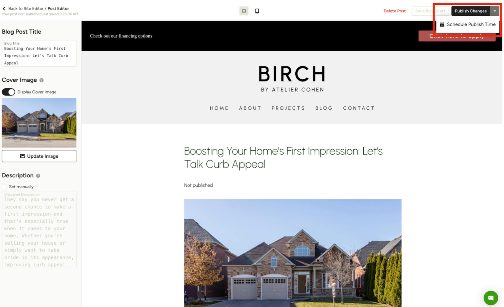 To start, create a new post or open an existing draft in your blog editor. Click on the dropdown arrow next to the Publish Changes button and click Schedule Publish Time.