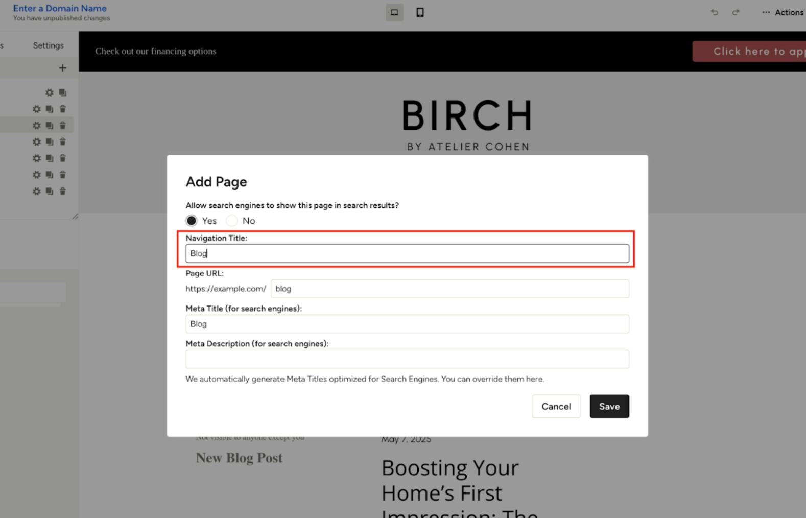 You can then name your blog page. This title will appear in your website's navigation. Click Save to create your blog.