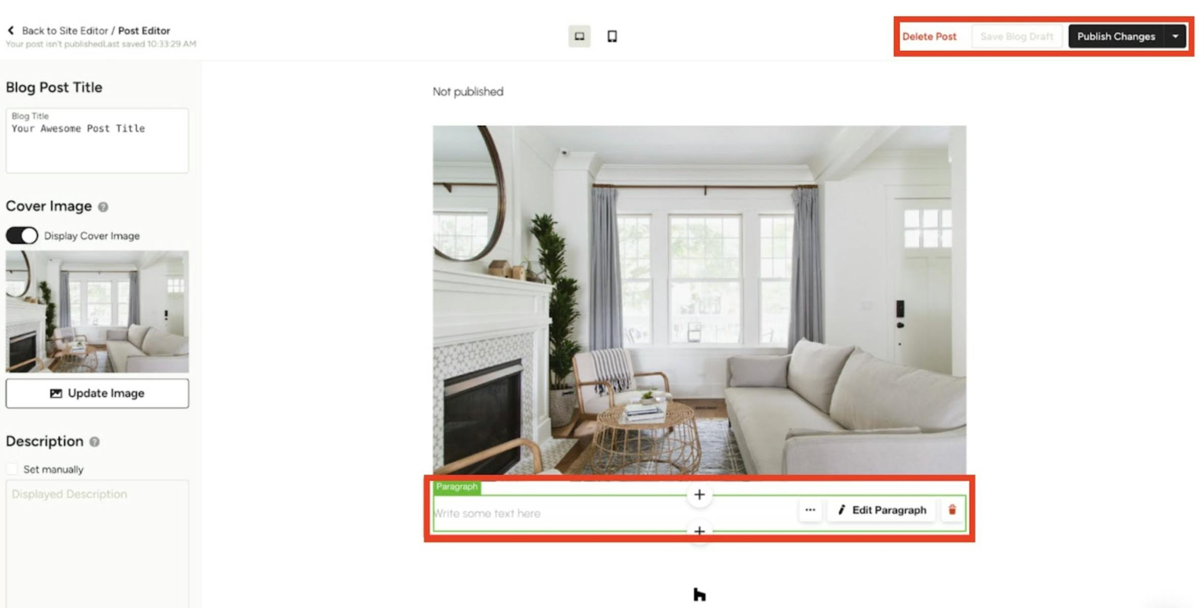 On the left-hand side of the editor, set the title of your blog post, and select a cover image.