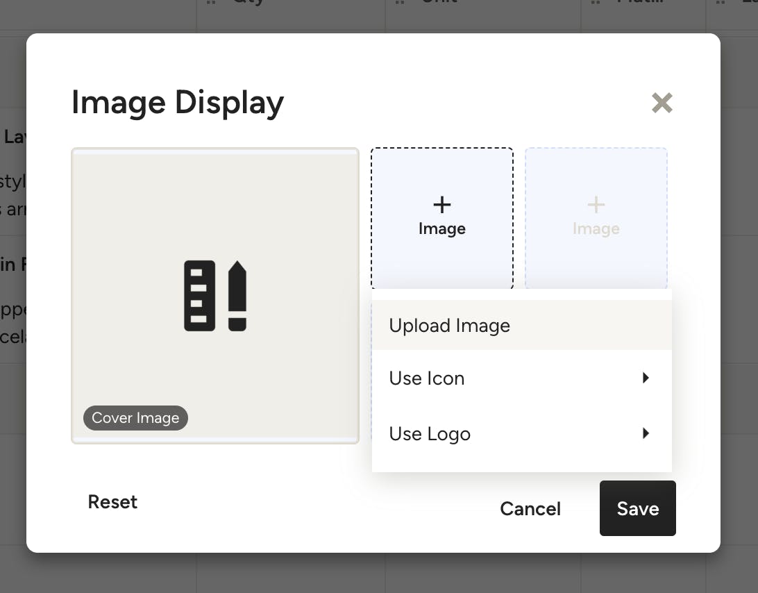4. When you edit the image: A screen will pop up where you can add up to five images. Click + Image and select from the options to upload an image, pick an icon or use your logo. The large one on the left will display as the cover image for the item. Click Save, and your line item images will now show up directly in your document.