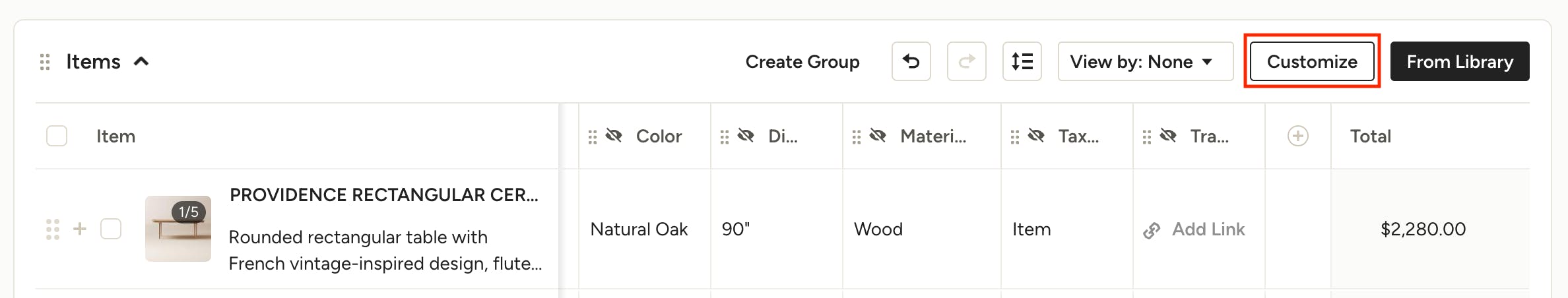 If you need to adjust your document's format, including adding or removing columns, item descriptions, images or numbering, select the Customize button at the top of your items section.