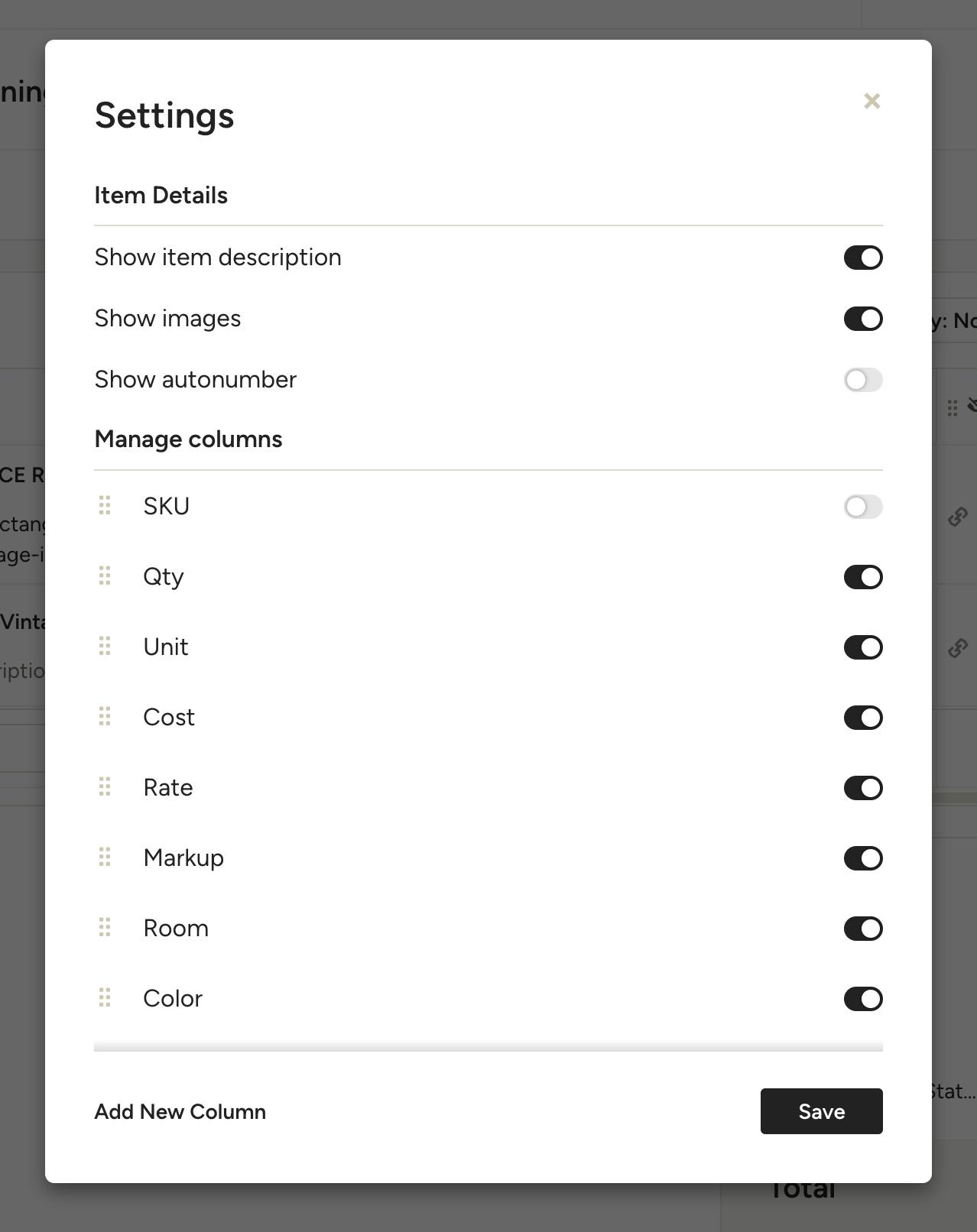 From here, you can toggle on and off columns, item descriptions, images and autonumbering based on what information you actually need.