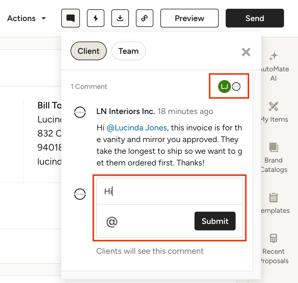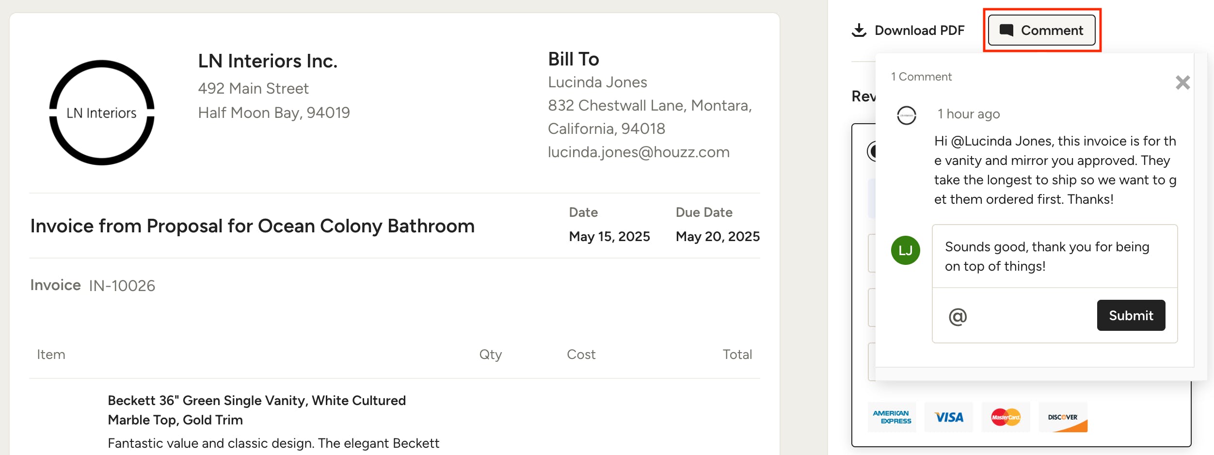 With the ability to comment on documents in Houzz Pro, you can converse with clients and team members directly on the relevant documents, keeping your communication organized and allowing you to easily reference document details. Currently commenting on documents is limited to client-facing documents (estimates, proposals, invoices, change orders, retainers and contracts).