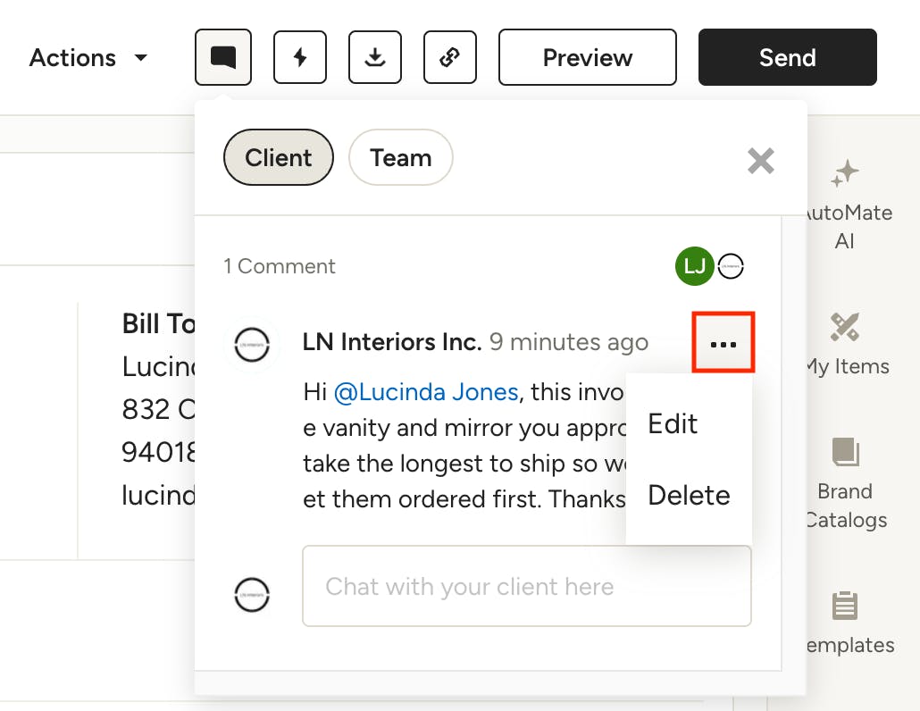 You can edit or delete comments that have been sent by clicking the three dots to the right of a comment and choosing the appropriate action. Note that once a comment has been sent, the client can see it in the content of the email notification they receive, even if you’ve edited or deleted it.