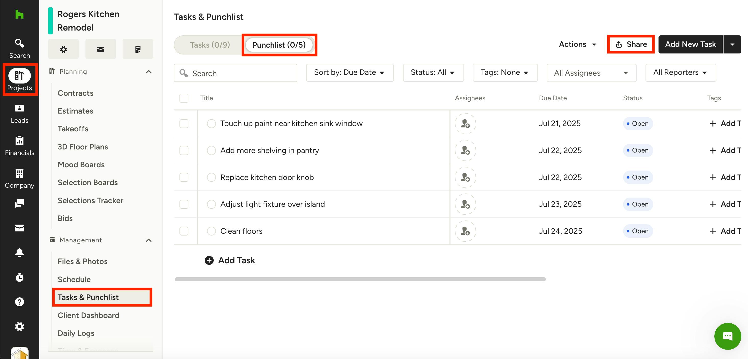 To share, click the Projects icon in the left navigation, then select the relevant project. Click Tasks & Punchlist from the left menu of the project overview page.