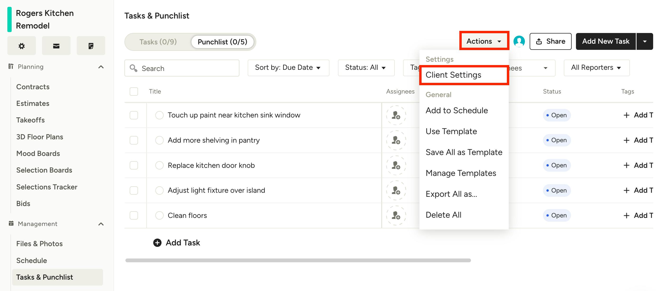 To start, click the Actions dropdown at the top of the project's Tasks and Punchlists page, then select Client Settings.