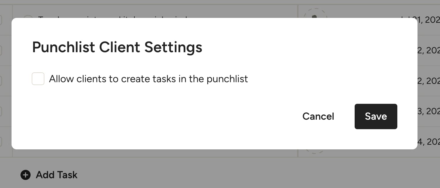 Check the box if you would like to give that client the ability to add tasks to the punchlist. Be sure to click Save once complete.