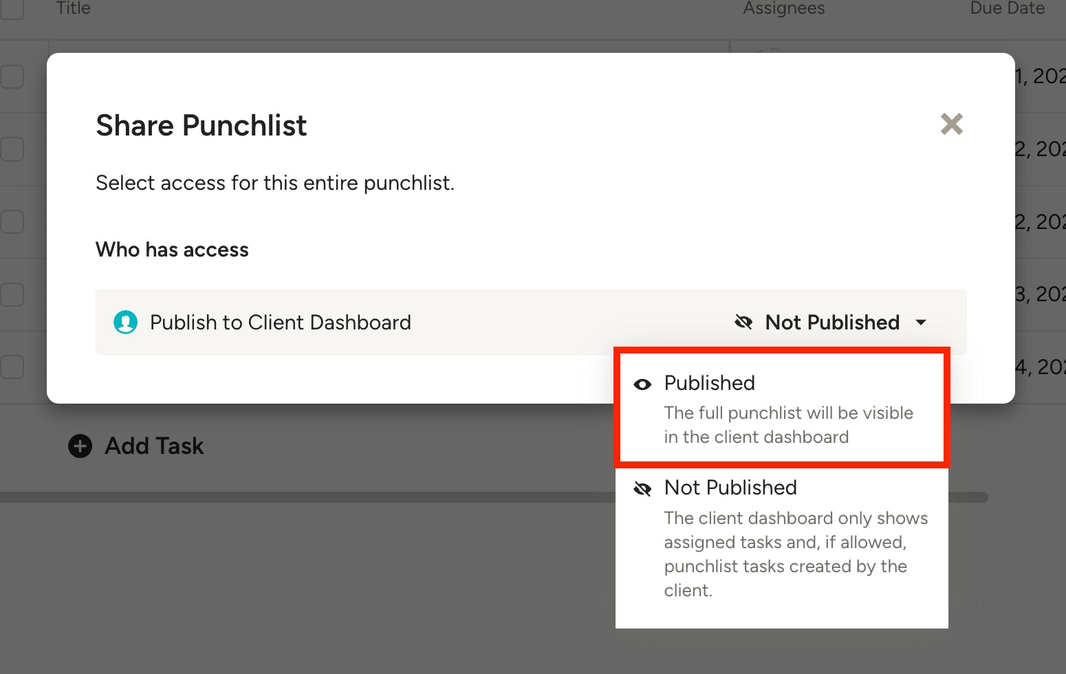 A new screen will appear where you can adjust the share settings for your punchlist. Select Published if you would like your client to be able to view. You can always come back to the share settings and unpublish later if needed.