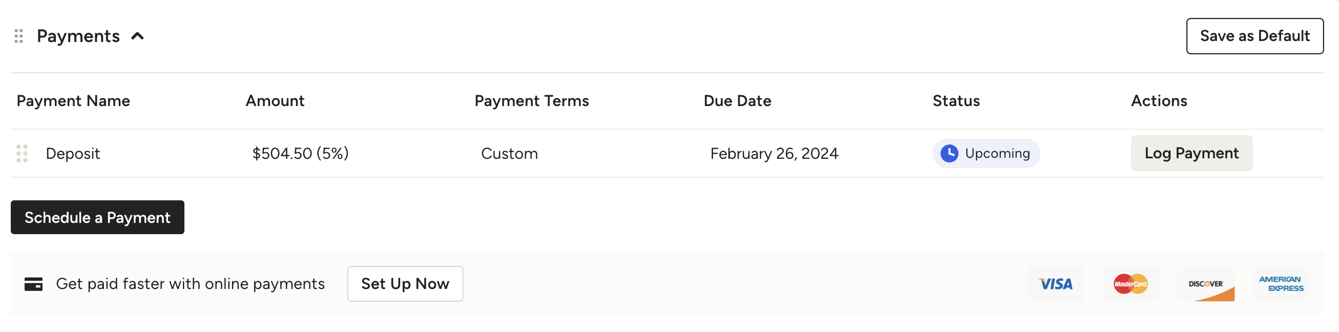 Once your payment schedule is complete, click Save as Default if you would like to have these payment settings automatically prefilled on future proposals.