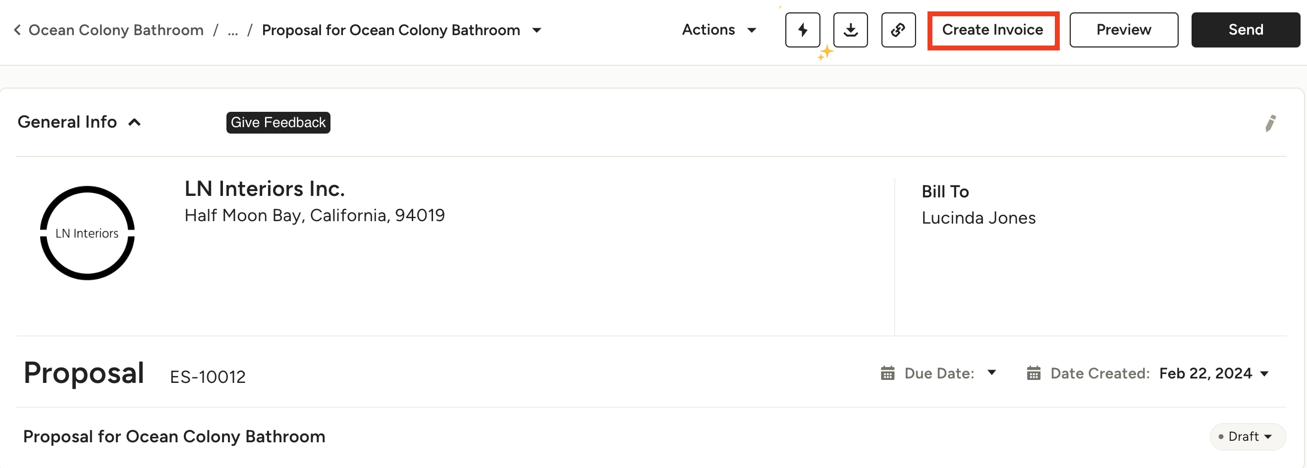 Whether or not you have logged a payment on your proposal, you can easily create an invoice for the remaining balance. To create an invoice, simply click on the Create Invoice button at the top of your proposal.