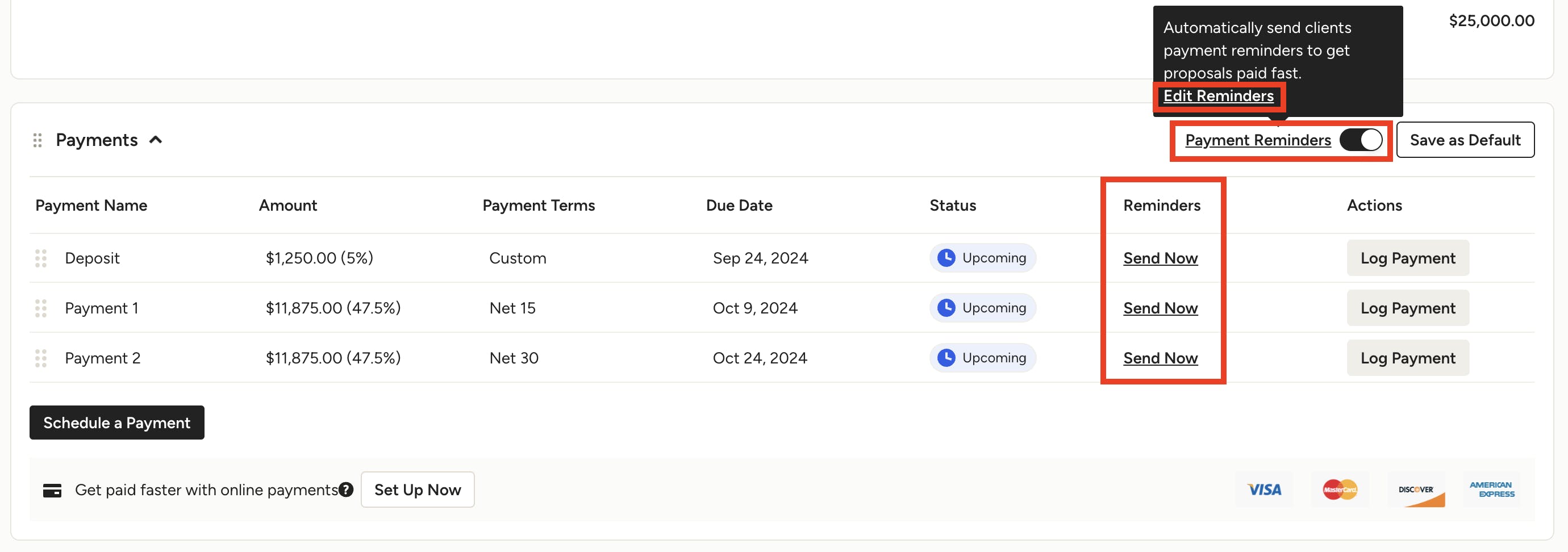 Once you send the proposal to your client, you can send automated or manual reminders to ensure payments are made on time. To send a reminder, turn on the Payment Reminders toggle at the top of the payments section.