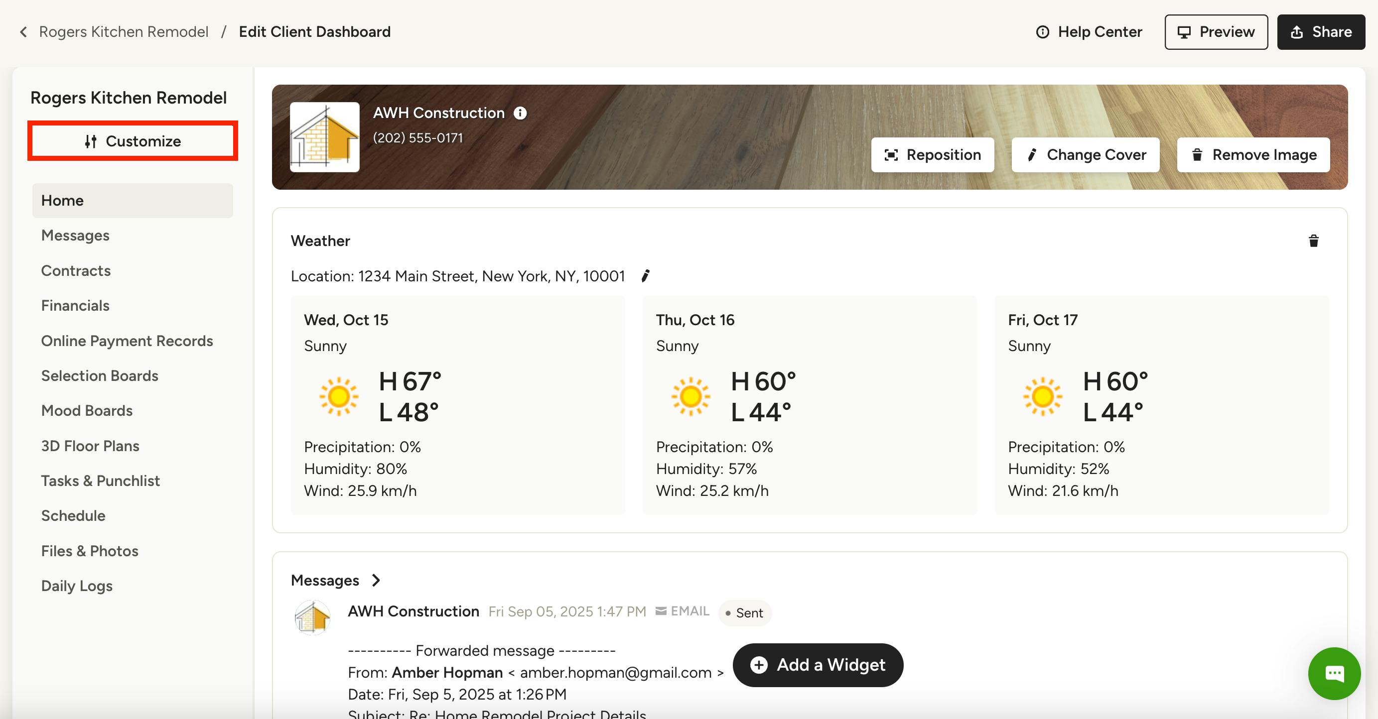 If you select Weather, you can showcase the weather report in your project location — just add the location zip code to update with local information. This helps the client stay informed about any weather conditions that might delay or impact your project schedule.