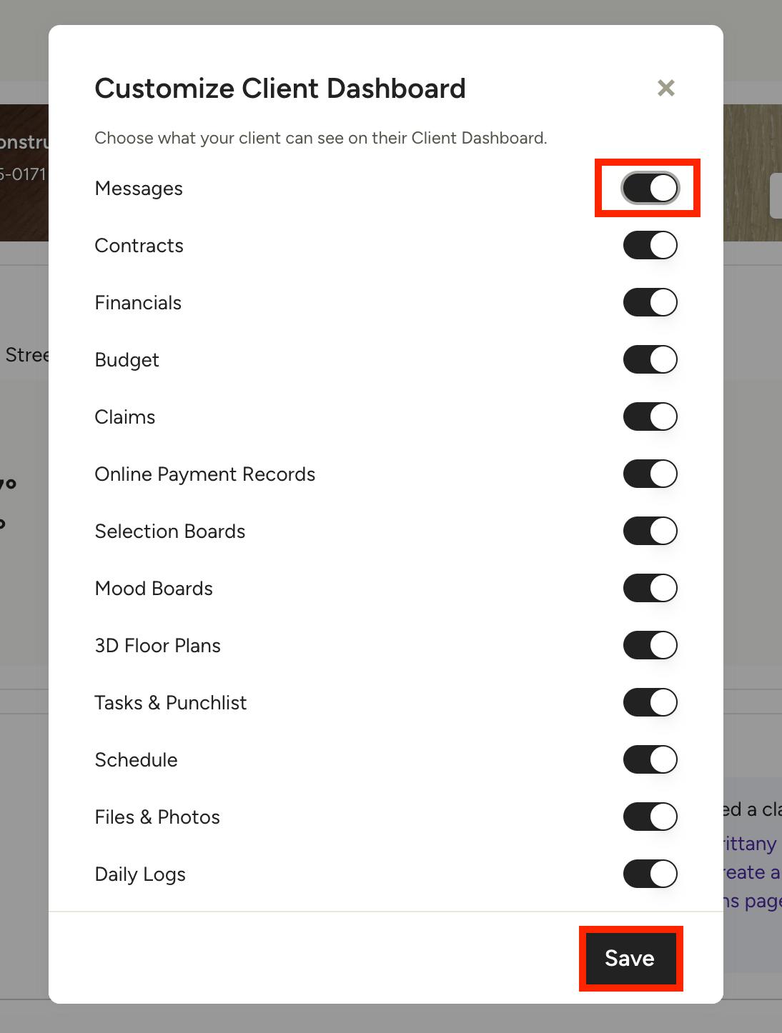 Please Note: While you can toggle on or off a section, that does not mean access has been shared with your client. The section will be empty until you give the client access to a specific document or feature. To learn more about this process, read How to Preview and Share the Client Dashboard.