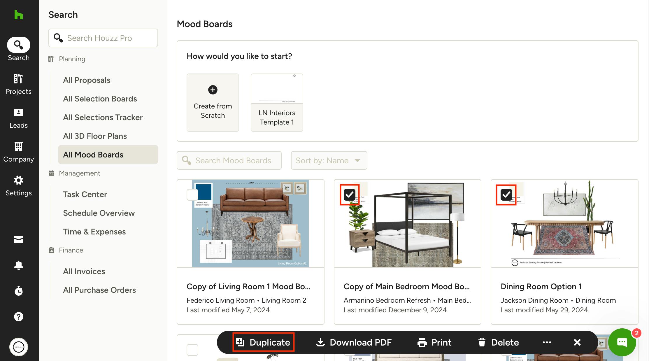 Mood boards can be duplicated to any existing project, or a new project, in a few quick steps. You can choose to duplicate one at a time, directly from within a mood board, or duplicate multiple mood boards at once. Here's how: