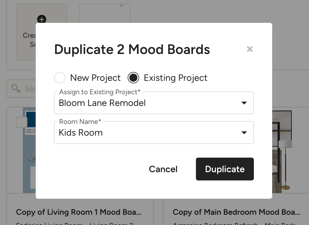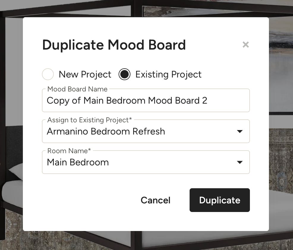 2. In the modal that opens, choose whether you want to duplicate to a new project or existing project, and select an existing room or create a new room. You can rename the mood board if desired. Once done, click Duplicate.