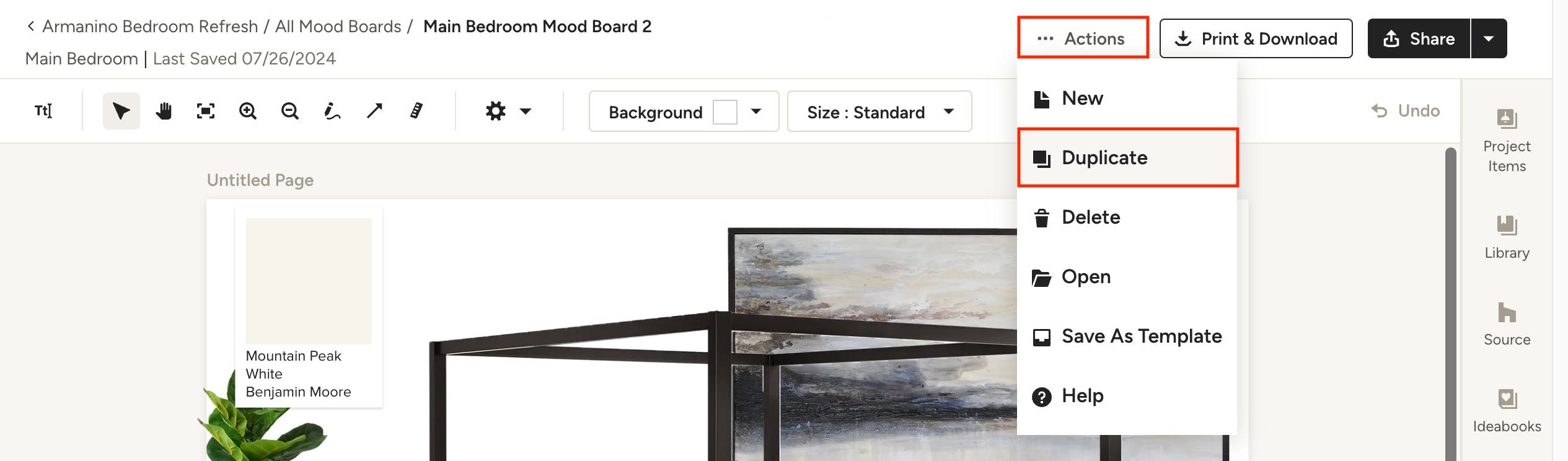 1. Open the mood board you want to duplicate and select Duplicate from the Actions menu at the top right of the page.
