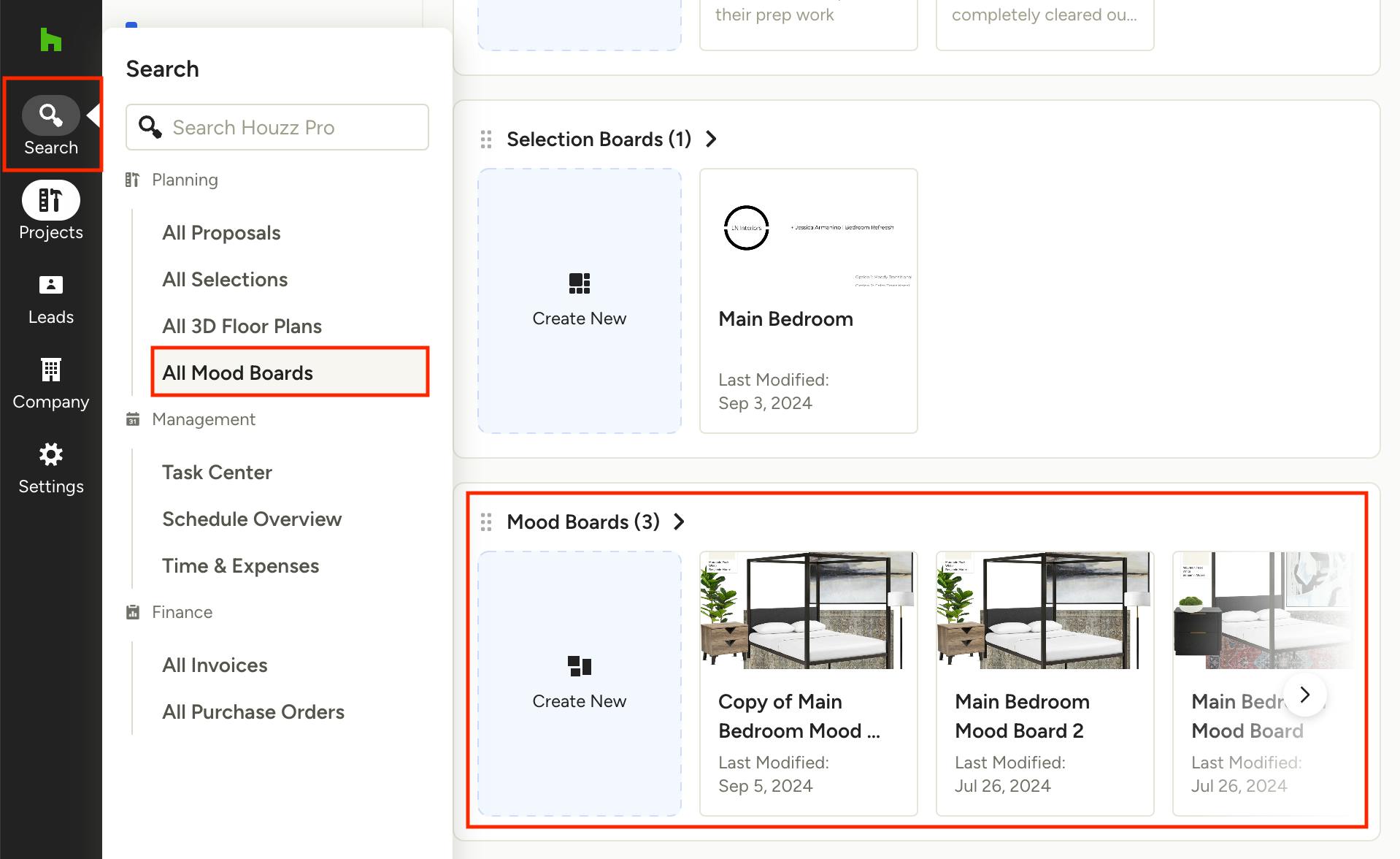 3. Your duplicates can be found in the mood board overview page of the project you duplicated them to, or in All Mood Boards, which is accessible under the search icon in the left navigation.