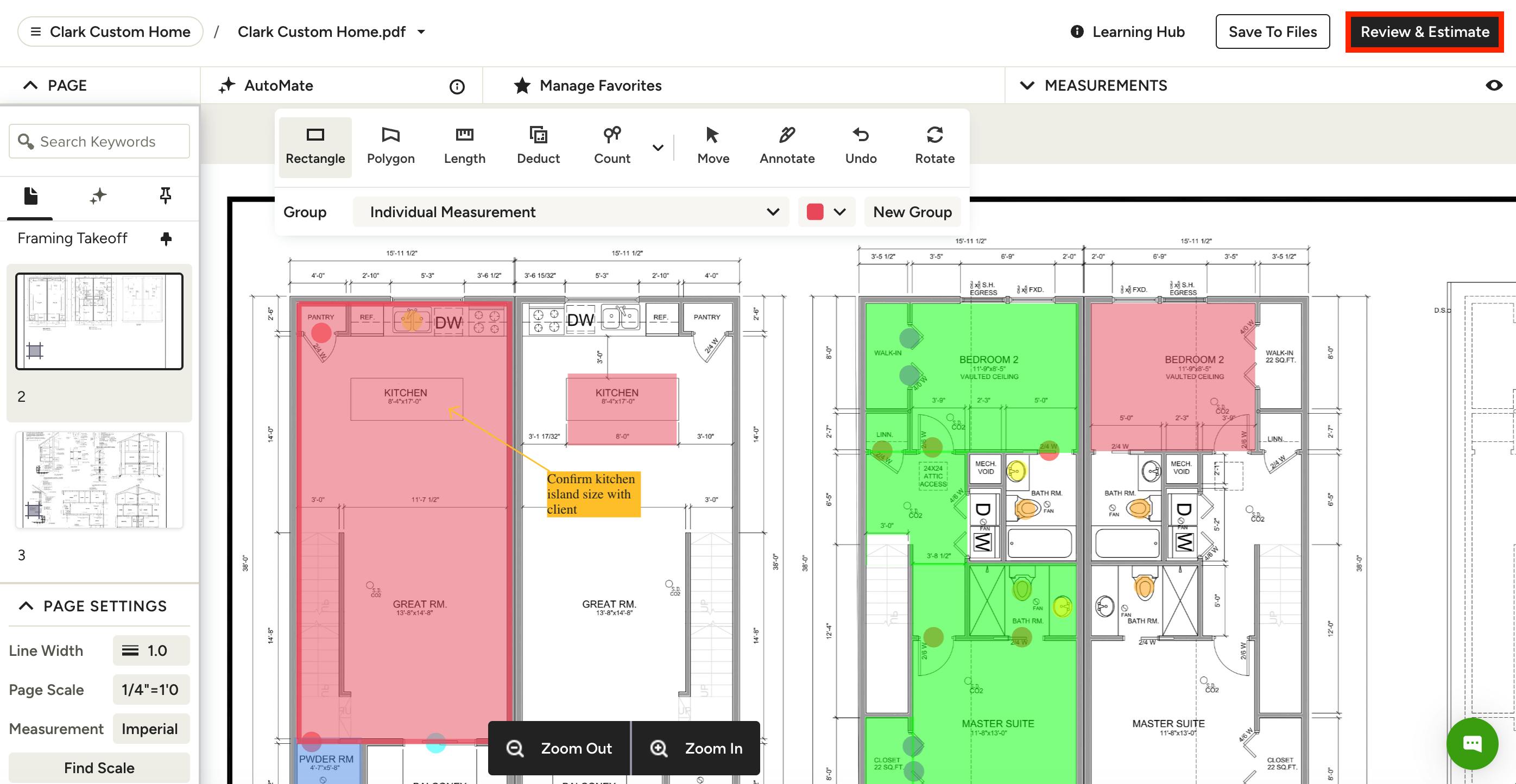 2. Make the relevant adjustments to your takeoff canvas. Click Review & Estimate in the top right corner to view the Takeoff Summary.