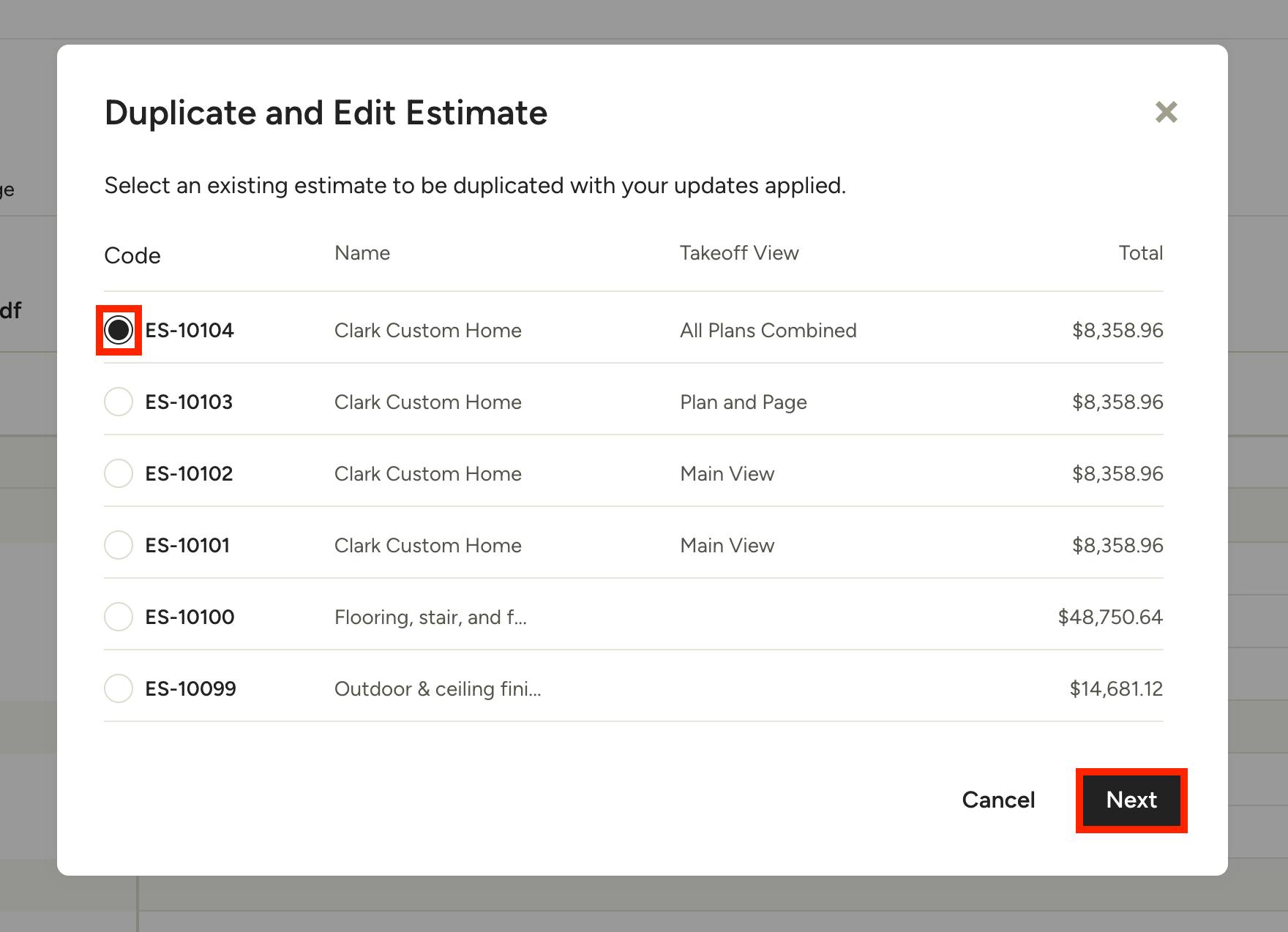 4. When you choose Duplicate and Edit, you must then select which of the previous estimates you want to duplicate. When you select an estimate, you will be able to reuse all your previous work, including any categories or groups. The estimate version will also show the View used — make sure the estimate View you want to use is correct, since that will impact the plans and pages included.