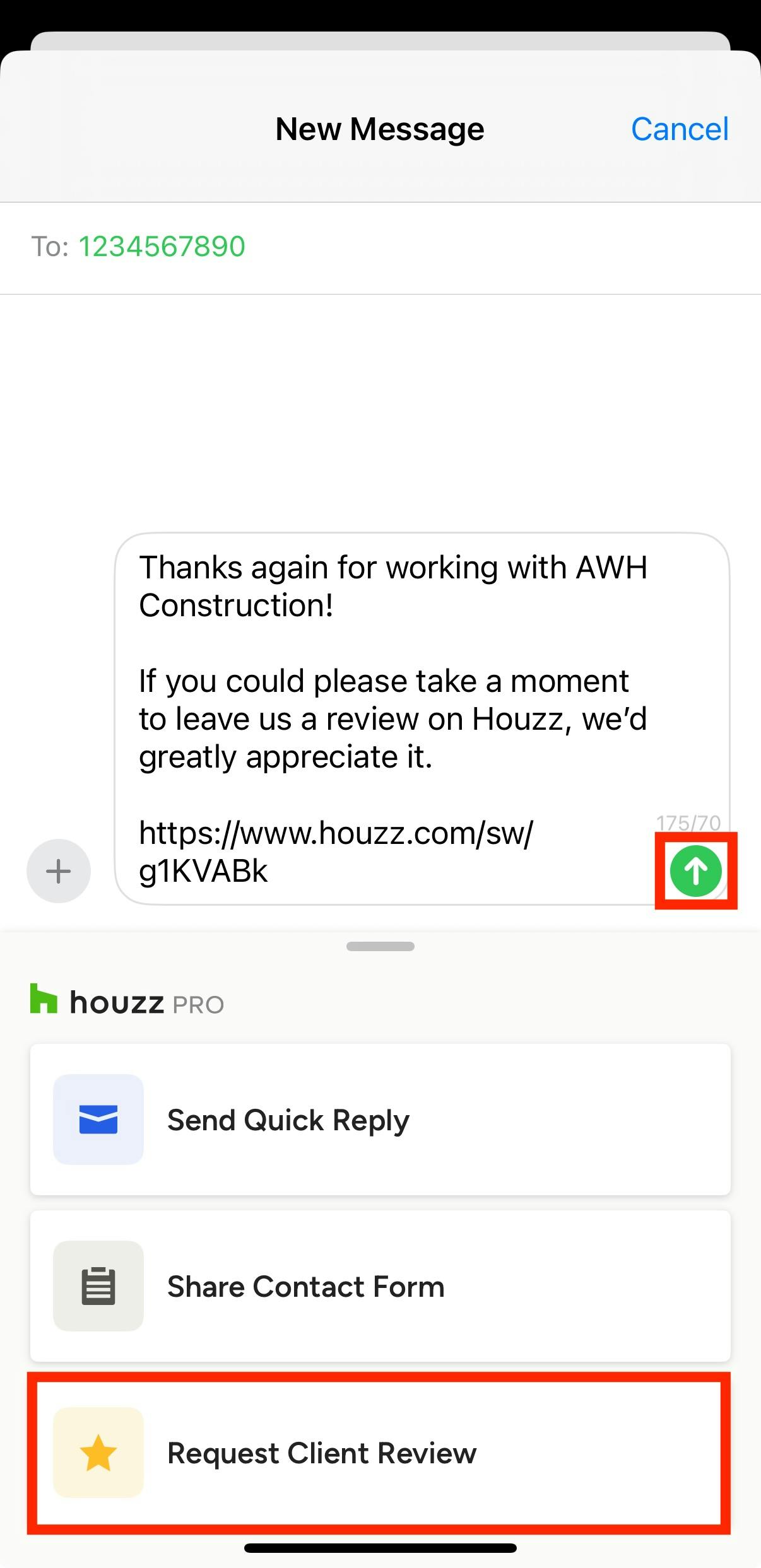You can easily request reviews from either your Houzz.com profile on a desktop computer, or from a text message using the iMessage text extension (iOS devices only).