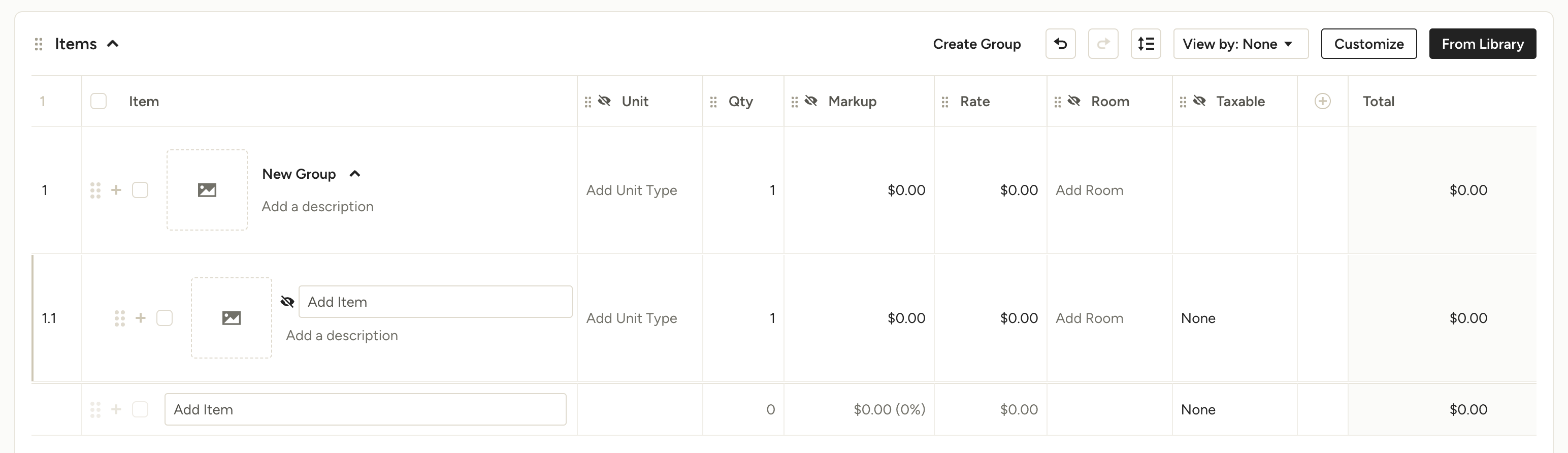 If you're working on a proposal or invoice that doesn't currently have the items you want to group, simply click Create Group in the Items toolbar.
