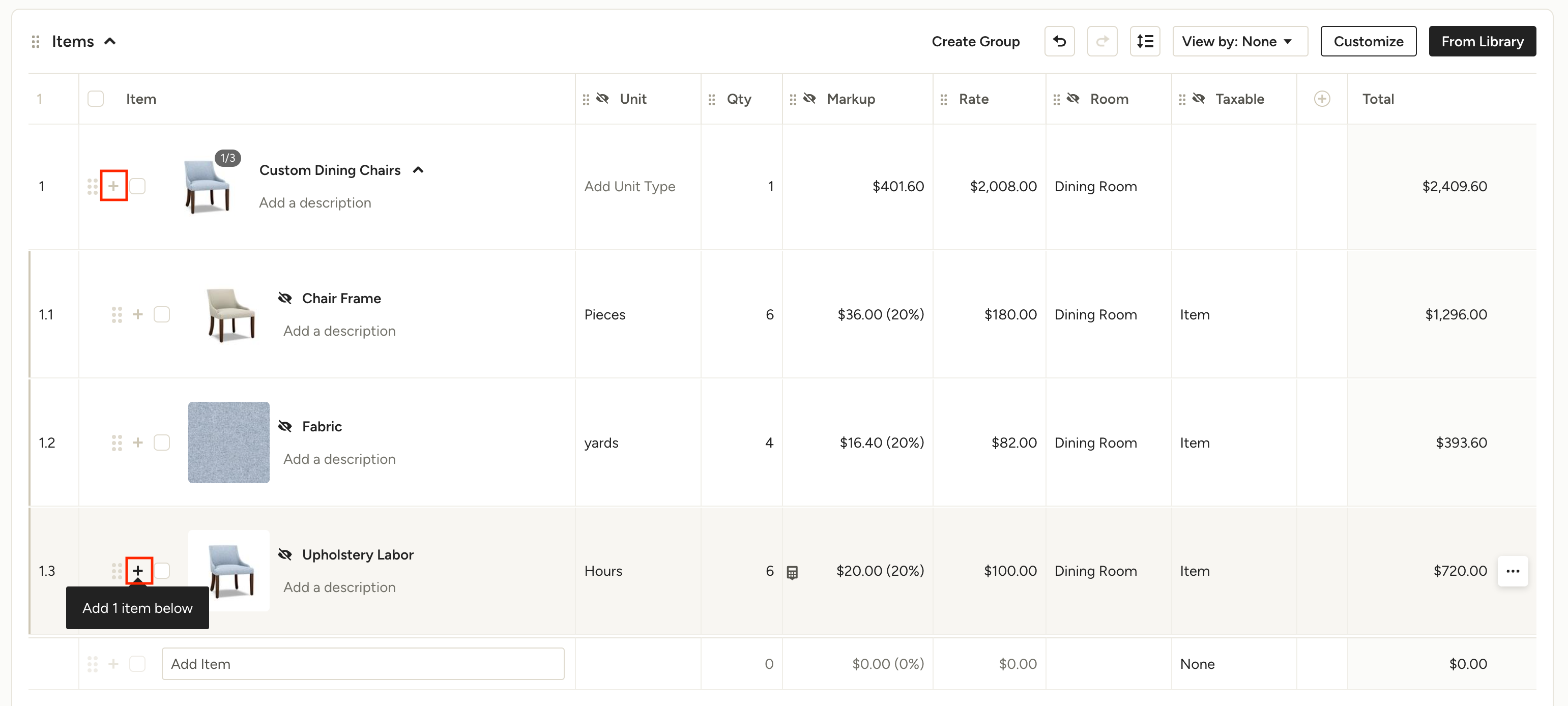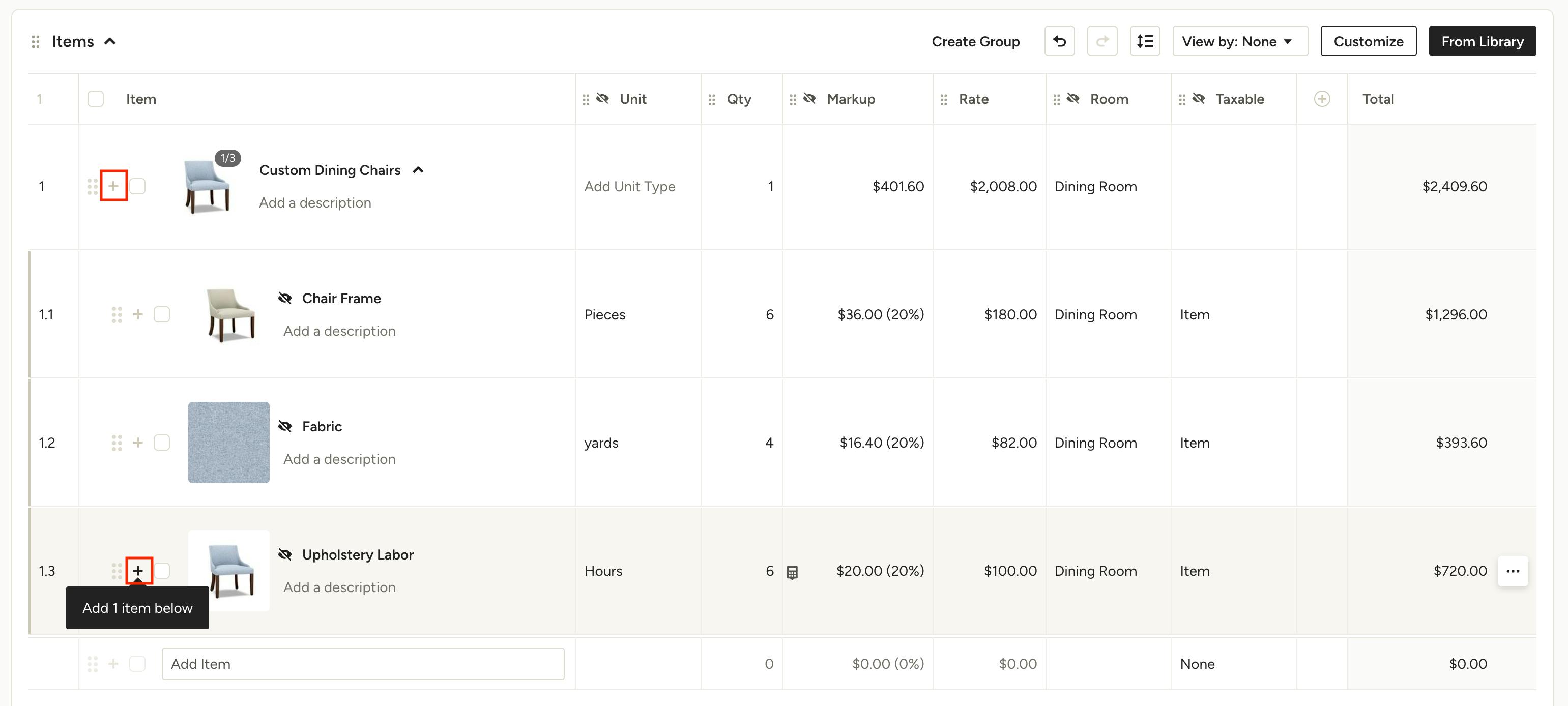 Grouping line items is the perfect way to add a custom piece to your proposal or invoice without showing your client all of the individual components. A custom chair, for example, can include fabric, labor and other materials that may come from multiple vendors and require separate purchase orders. With line item grouping, by default all your client sees is the main line item, while the full list of components remains visible only to your firm on the internal version of your document(s).
