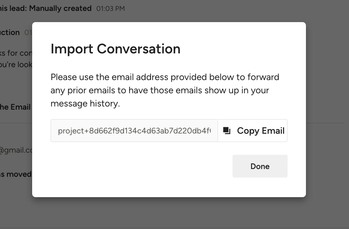 A new screen will appear. The email address listed is where you will forward email threads that you would like to add to this Houzz Pro lead.