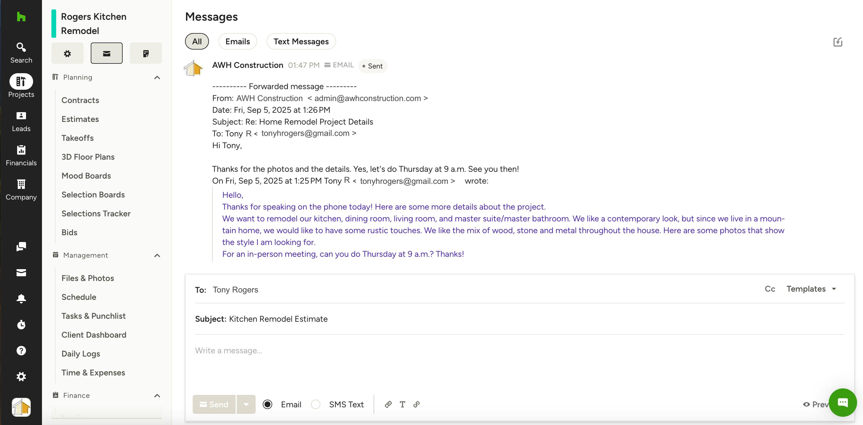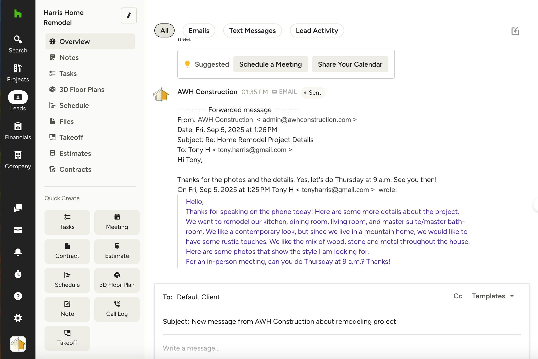 Once sent, the email thread will automatically appear in the project's message center. Now, you can easily reference the details in that email and move forward with next steps, such as scheduling meetings, creating tasks, and more.