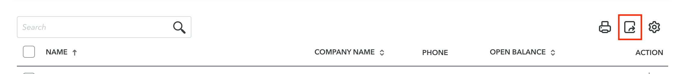 3. Click the Export icon (the middle icon) on the right-hand side above the customer list. This will download your QuickBooks Online contacts as an Excel file.