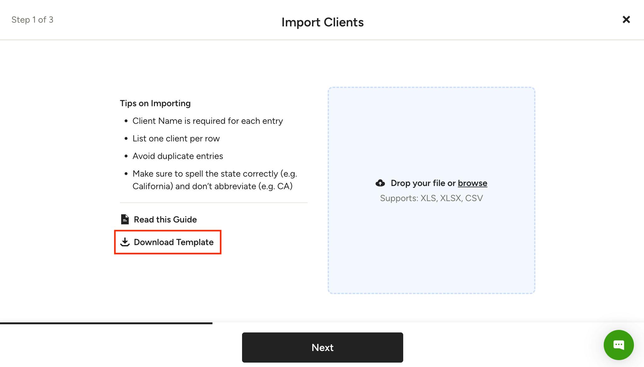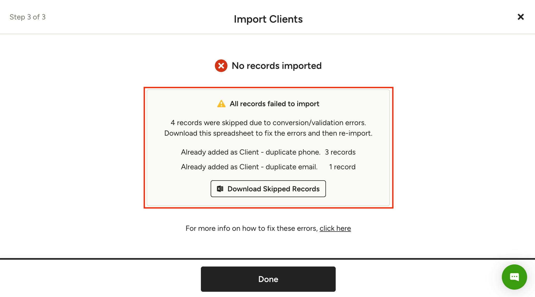 If some entries within your file fail to upload, the remaining entries that succeed will still be successfully uploaded to your Clients list. In Step 3 of 3, if any errors occur, you will see how many entries/records failed and what the errors are. You then have the ability to download the skipped records, fix them and re-upload again.