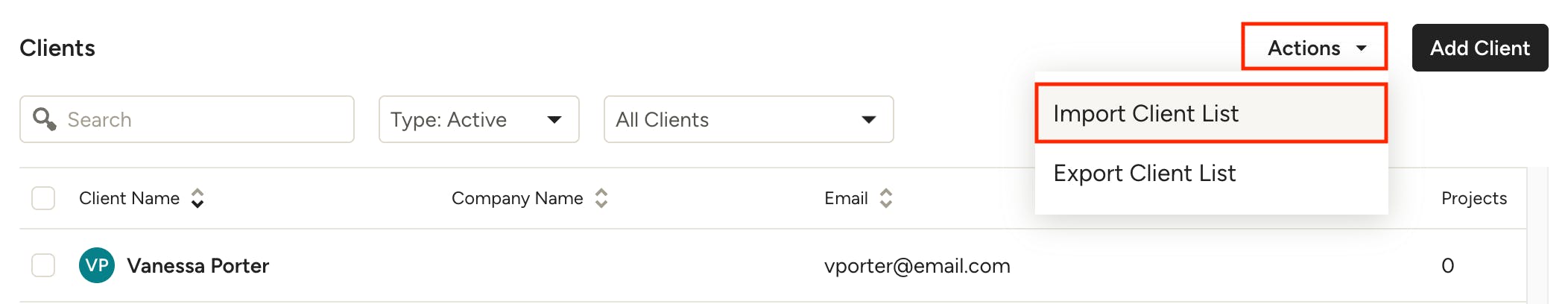 2. Under the Actions menu in the upper right, click "Import Client List".