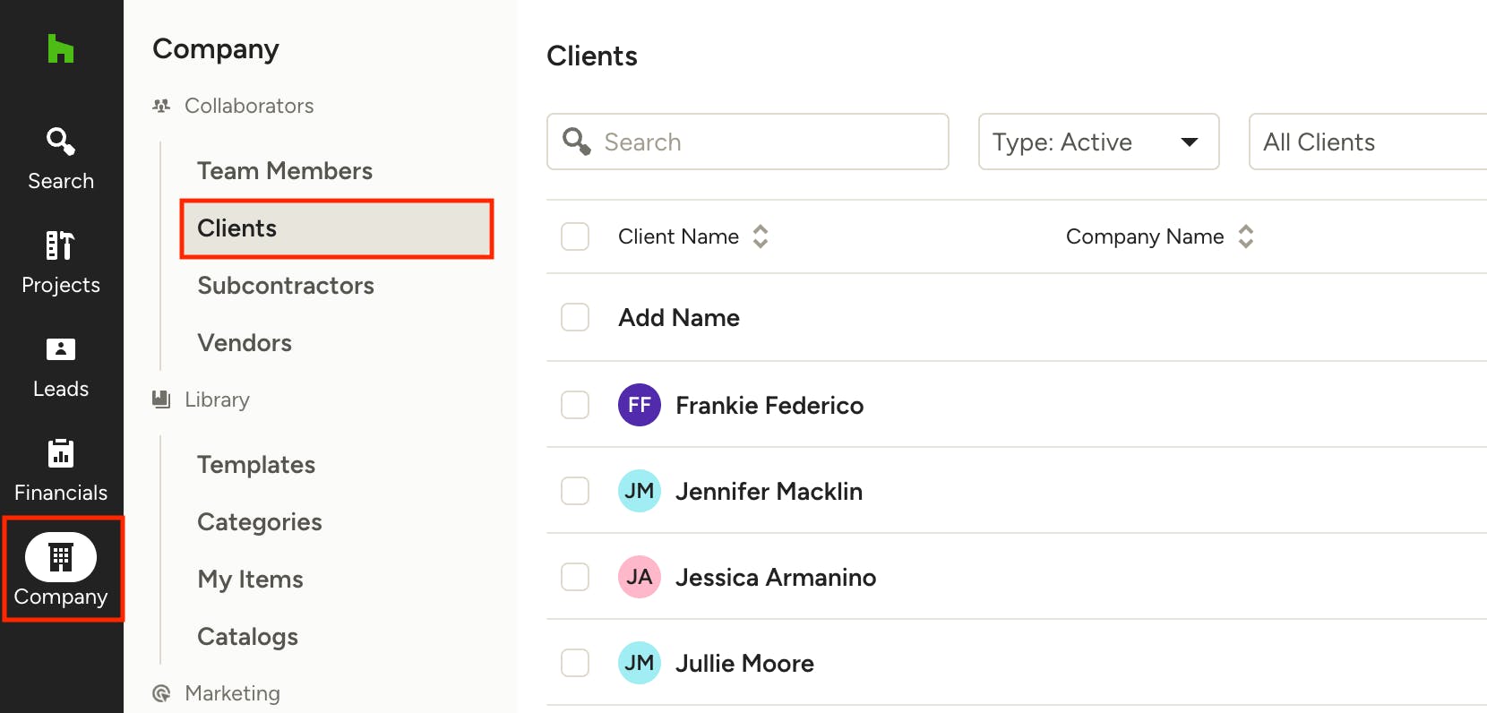 1. In the Company menu, select the Clients section.