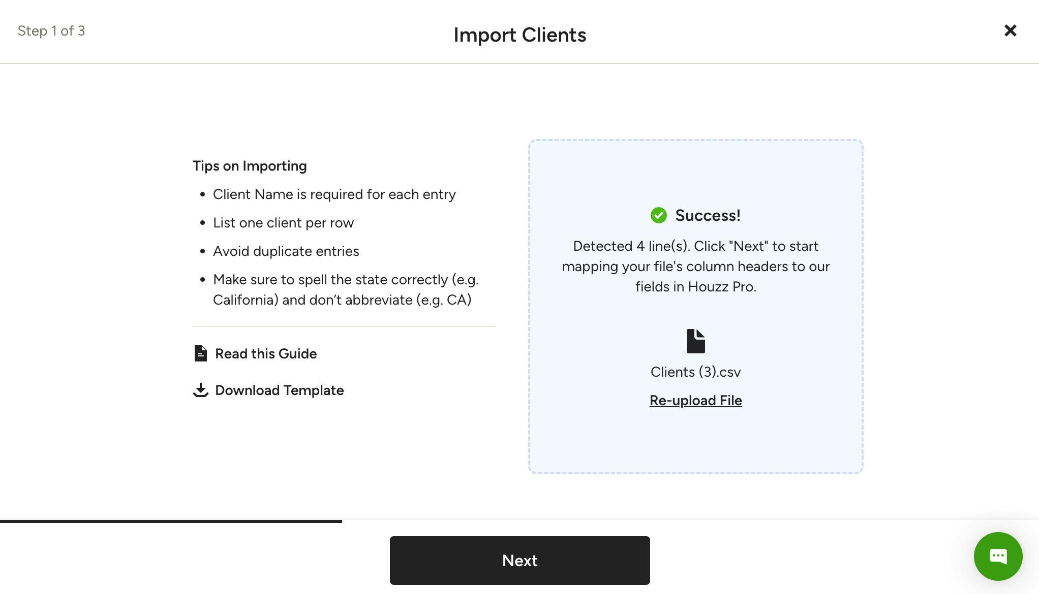 6. In the import screen, click "browse" and attach the file, or drag and drop the file into the box. If successful, you will see a message noting how many lines the system detected in your file. Click Next to start mapping your files columns to Houzz Pro fields.