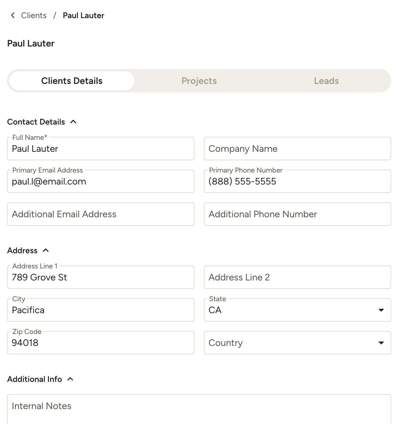In the client list, you can see the main details for each contact. To edit a client's details or view their projects and/or leads, click their name or use the three dots to the far right of their details to access more options.