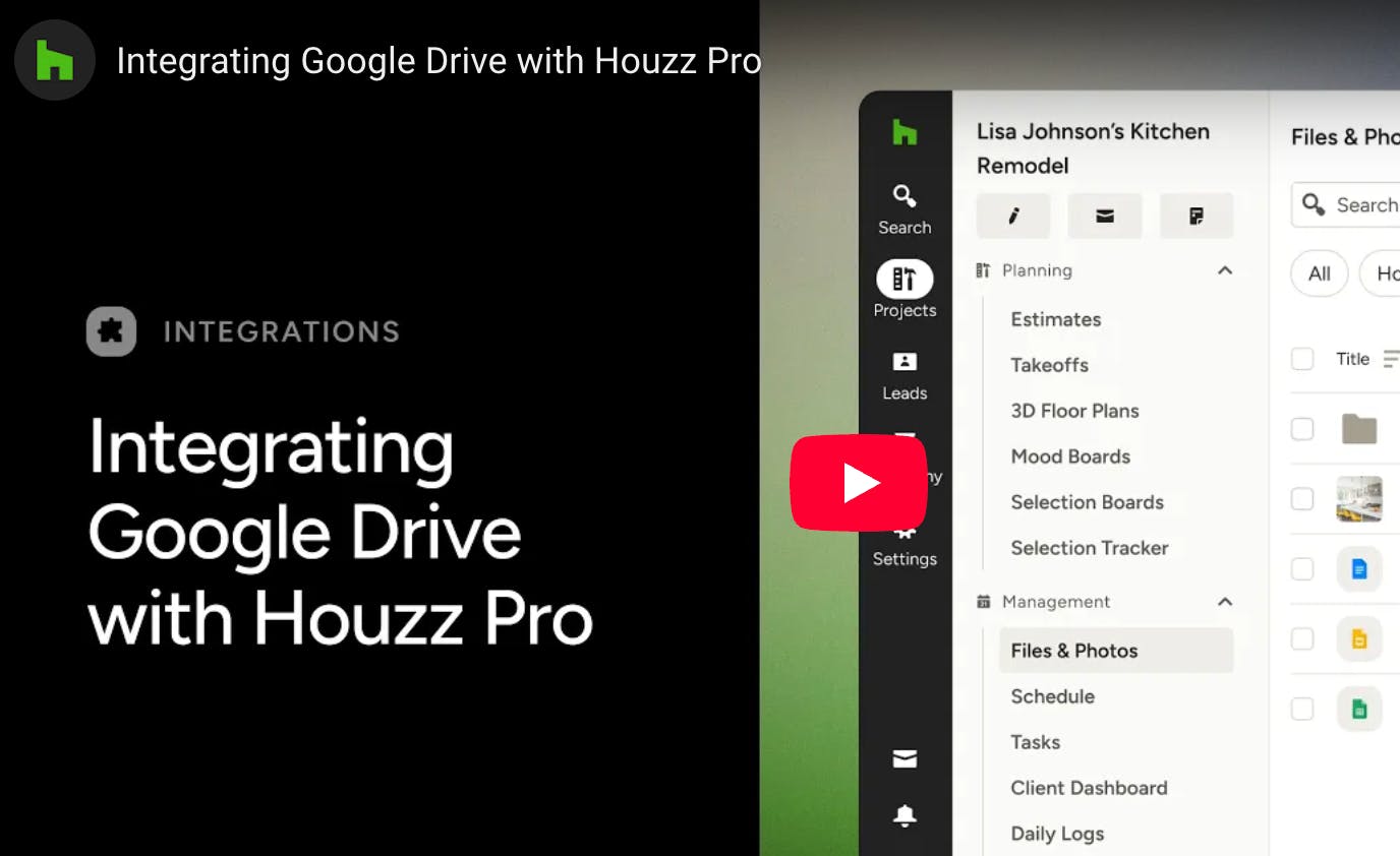 With Houzz Pro, you can easily streamline your workflow and improve efficiency by importing files and photos from Google Drive. This quick integration ensures that all your important files are in Houzz Pro so you can share with your clients, team, or subcontractors.